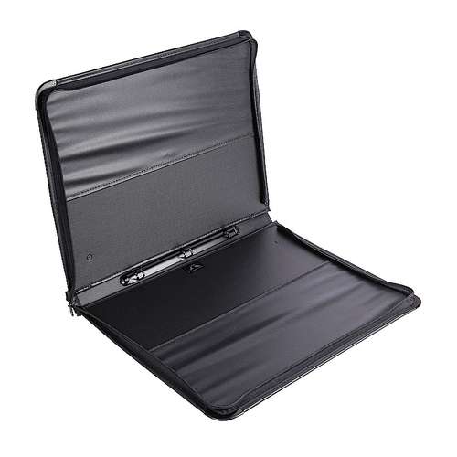 Exklusive, schwarze Ringmappe aus PVC in Lederoptik gemasert. Eine im Rücken eingearbeitete Metalleinlage verleiht dieser Mappe eine sehr hohe Stabilität und Formbeständigkeit.