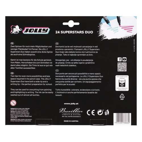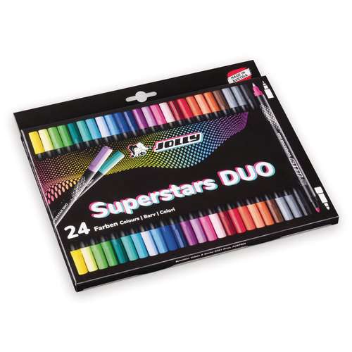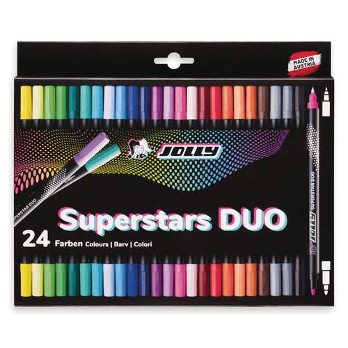 JOLLY Superstars Duo Fasermaler 24er-Set. Tolle Filzstifte mit zwei Spitzen zum Ausmalen größerer Flächen und für Linien und Konturen. Erhältlich im Kartonetui.