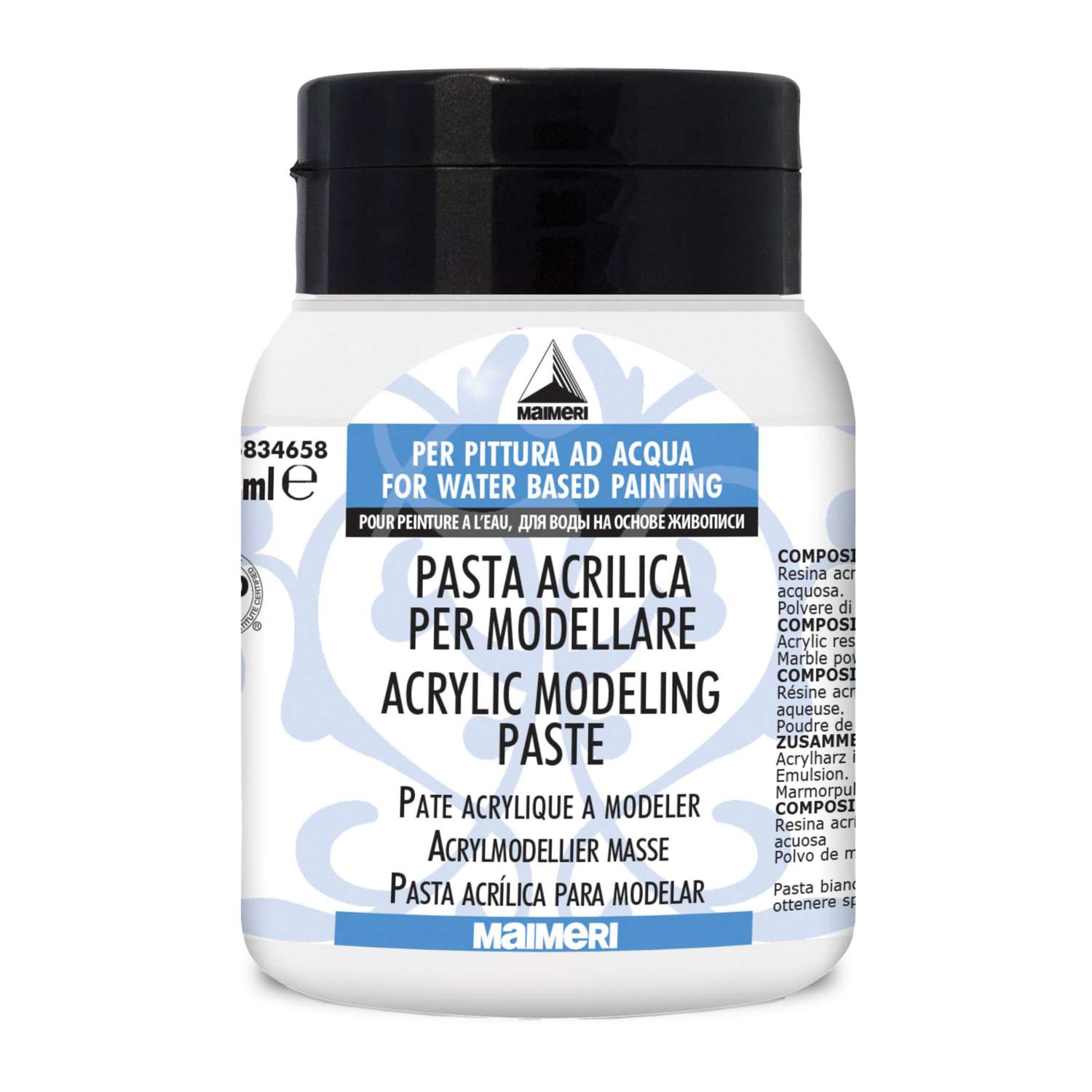 Die MAIMERI ACRILICO Acryl-Modellierpaste ist eine gebrauchsfertige, weiße Strukturpaste für die Acrylmalerei. Sie eignet sich ideal zum Aufbau plastischer Oberflächen, für Reliefs und modellierte Strukturen. Die Paste kann pur verwendet oder mit Acrylfarben eingefärbt werden. Nach dem Auftragen trocknet sie matt und hart aus, bleibt dabei jedoch rissfest und stabil. Sie lässt sich nach dem Trocknen problemlos übermalen und mit weiteren Schichten kombinieren. Dank ihrer vielseitigen Eigenschaften ist sie für Malerei, Collagen und Mixed Media geeignet. Mit ihrer hohen Deckkraft und cremigen Konsistenz ermöglicht sie sowohl gleichmäßige Flächen als auch ausdrucksstarke Strukturen.