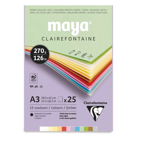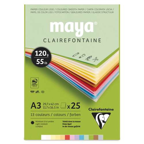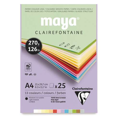 Clairefontaine MAYA ist leuchtendes und farbiges Papier, in der Masse gefärbt und lichtbeständig. Vorder- und rückseitig glatt. Die farbige Oberfläche ist ideal für präzises Zeichnen. Perfekt geeignet für kreative Freizeitaktivitäten, wie z. B. Schneiden, Kleben und Falten.