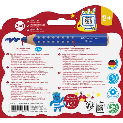 Der 3 in 1 FABER-CASTELL Grippy ist als Buntstift, Wachsmalkreide und Aquarellstift einsetzbar!