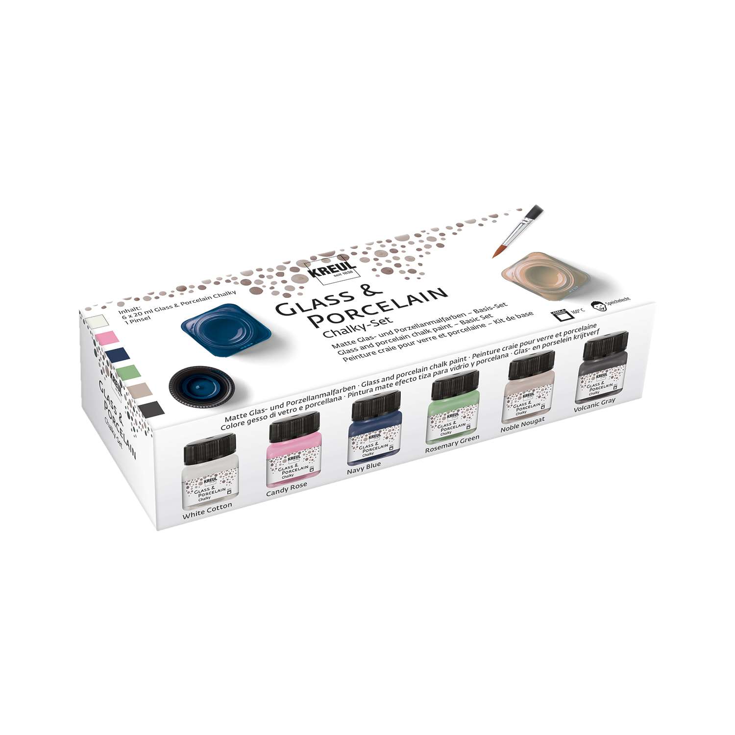 Das KREUL Glass & Porcelain Set Chalky enthält sechs matte Glas- und Porzellanfarben in modernen Kreidetönen sowie einen Pinsel zur direkten Anwendung. Die Farben sind wasserbasiert und bieten auf Glas, Porzellan, Keramik und glasierten Oberflächen eine weiche matte Optik mit sanfter Oberfläche. Nach dem Trocknen und Einbrennen sind die Farben spülmaschinenbeständig und ermöglichen Ihnen vielfältige Gestaltungstechniken wie Akzente, Beschriftungen oder flächige Dekorationen. Die Kreidetöne reichen von zartem Weiß über pastellige und gedeckte Nuancen bis hin zu kräftigen Akzenten. Ideal für Kreativprojekte im modernen, minimalistischen Stil.