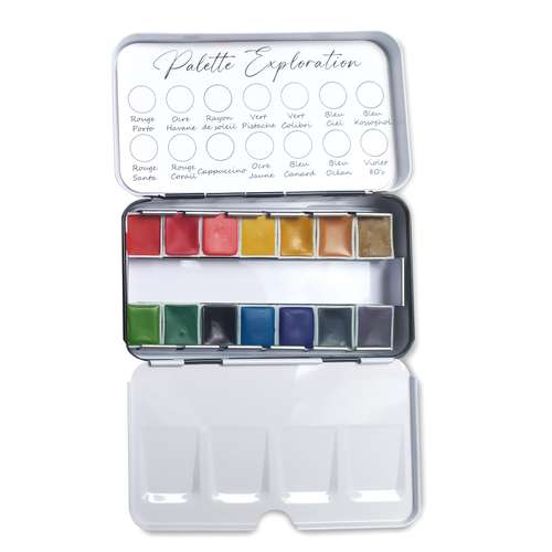 - Exploration (14 halbe Näpfchen): Sunbeam, Yellow Ochre, Havana Ochre, Cappuccino, Porto, Coral, Santa Red, 80s Violet, Pistachio, Hummingbird, Sky, Ocean Blue, Hossoghol, Duck