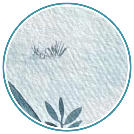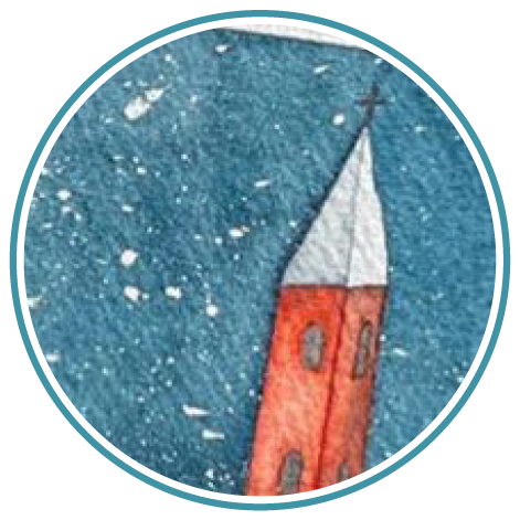Als nächstes sollten Sie unbedingt den Schnee malen, um zu vermeiden, dass Sie diese Bereiche später erneut bearbeiten müssen und so riskieren, dass das Rot der Häuser oder das Blau des Flusses dort reinlaufen, wo Sie es nicht wollen. Befeuchten Sie wie beim Himmel, mit einem sauberen Pinsel die Bereiche, in denen Sie einen Schneeeffekt erzeugen möchten (Dächer der Häuser und Boden). Tragen Sie dann ganz einfach einen Hauch von verdünntem Hellblau auf, um den eisigen Effekt der verschneiten Landschaft zu verstärken. Nachdem die Farbe trocken ist, nehmen Sie wieder dasselbe Blau wie das des Himmels und zeichnen einige durch die Kälte kristallisierte Pflanzen.