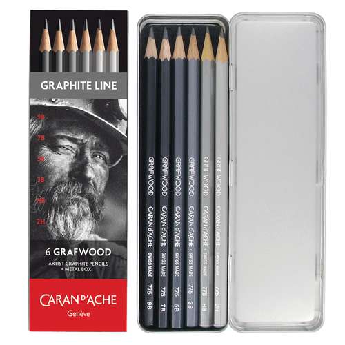 Das CARAN D'ACHE® GRAPHITE LINE-Set enthält 6 x GRAFWOOD Stifte. Abgestufte Schwarztöne für Profis mit verschiedenen Härtegraden, von fest bis weich. Die Stifte bieten die gesamte Palette der Graphitminen. Auf dem Lack der Stifte sind der genaue Härtegrad und der Schwarzton angegeben.