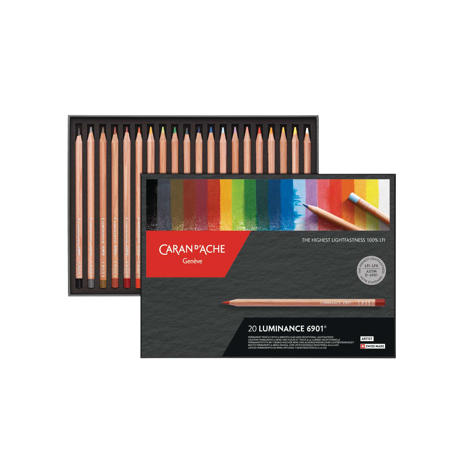 Die CARAN D'ACHE Farbstifte-Sets Luminance 6901 bestehen zu 80-100% aus LFI-zertifizierten Farben. Diese hochwertige Auswahl besteht mehrheitlich aus monopigmentären Farben. Die gesättigten Grundfarben ermöglichen es, Reinheit, Transparenz und Leuchtkraft herauszuarbeiten.