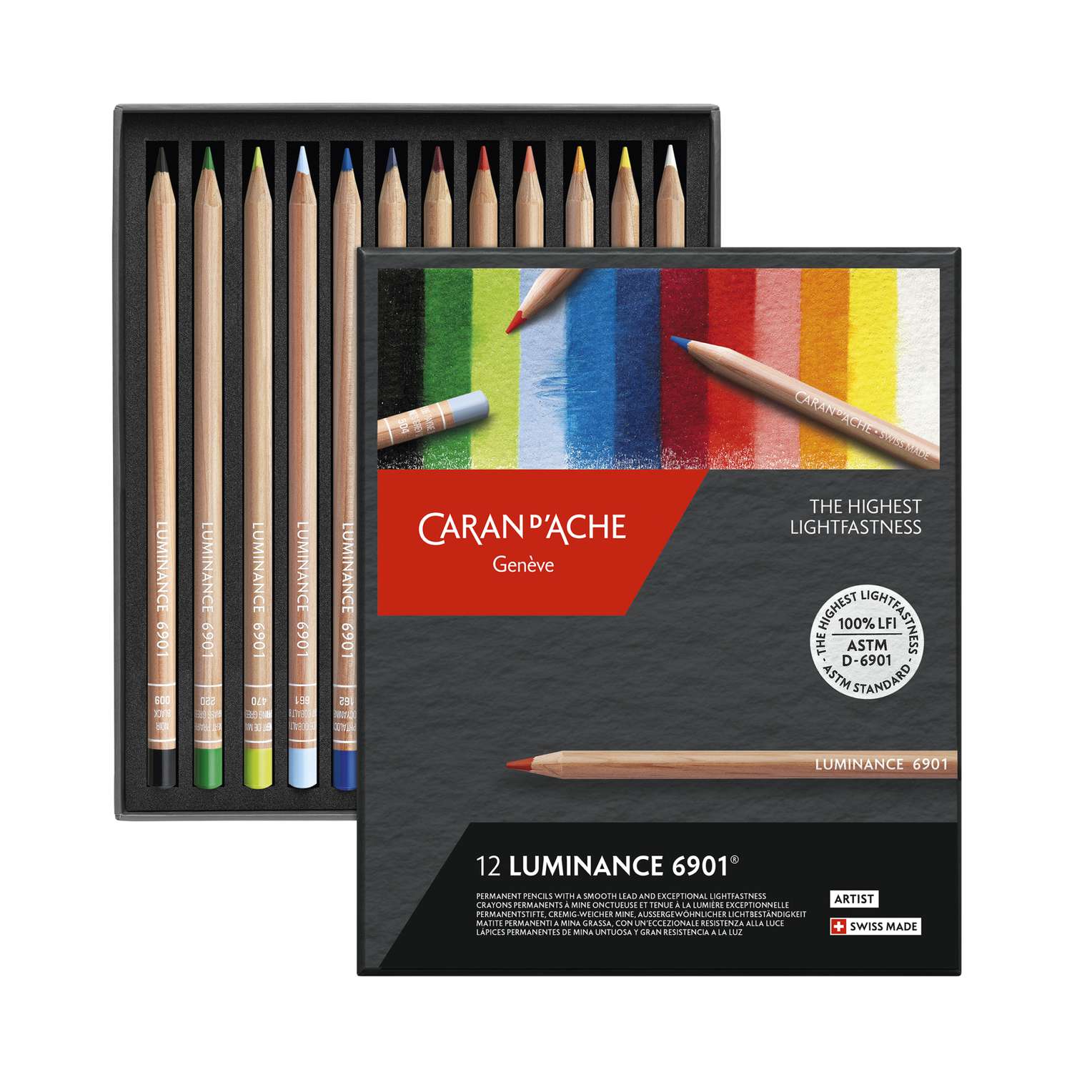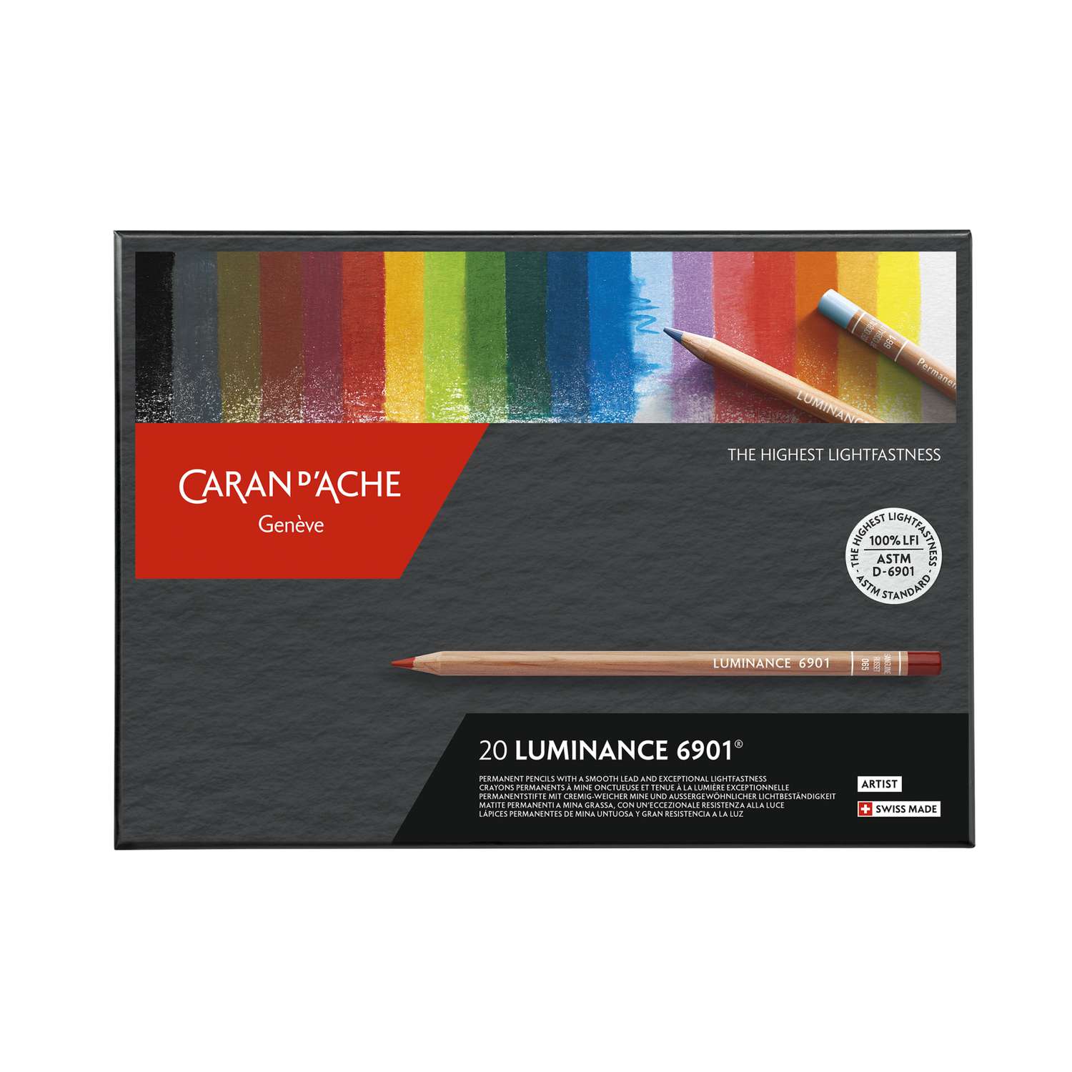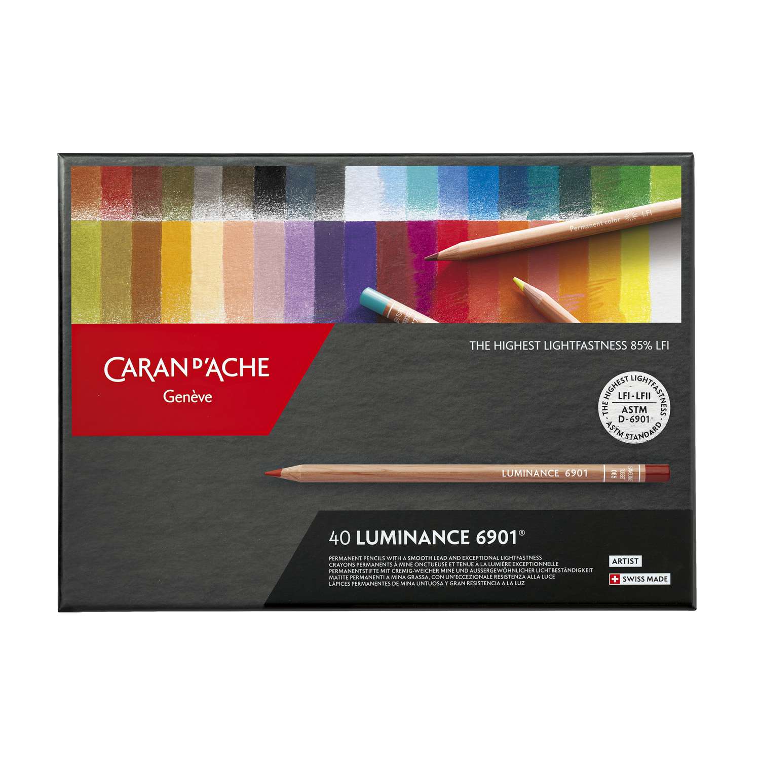 Der CARAN D'ACHE Farbstifte-Sets Luminance 6901 wurde in der berühmten Genfer Manufaktur speziell für den professionellen Gebrauch entwickelt. Die hochqualitativen Minen sind prädestiniert für Werke, die für Ausstellungen und Museen vorgesehen sind. Die Lichtbeständigkeit entspricht den höchsten internationalen Standards: ASTM D6901. Der Farbstift verfügt über eine besonders hohe Pigmentkonzentration für perfekt leuchtende und intensive Farben. Er ist rund, seine Kapsel ist in der Minenfarbe gehalten.