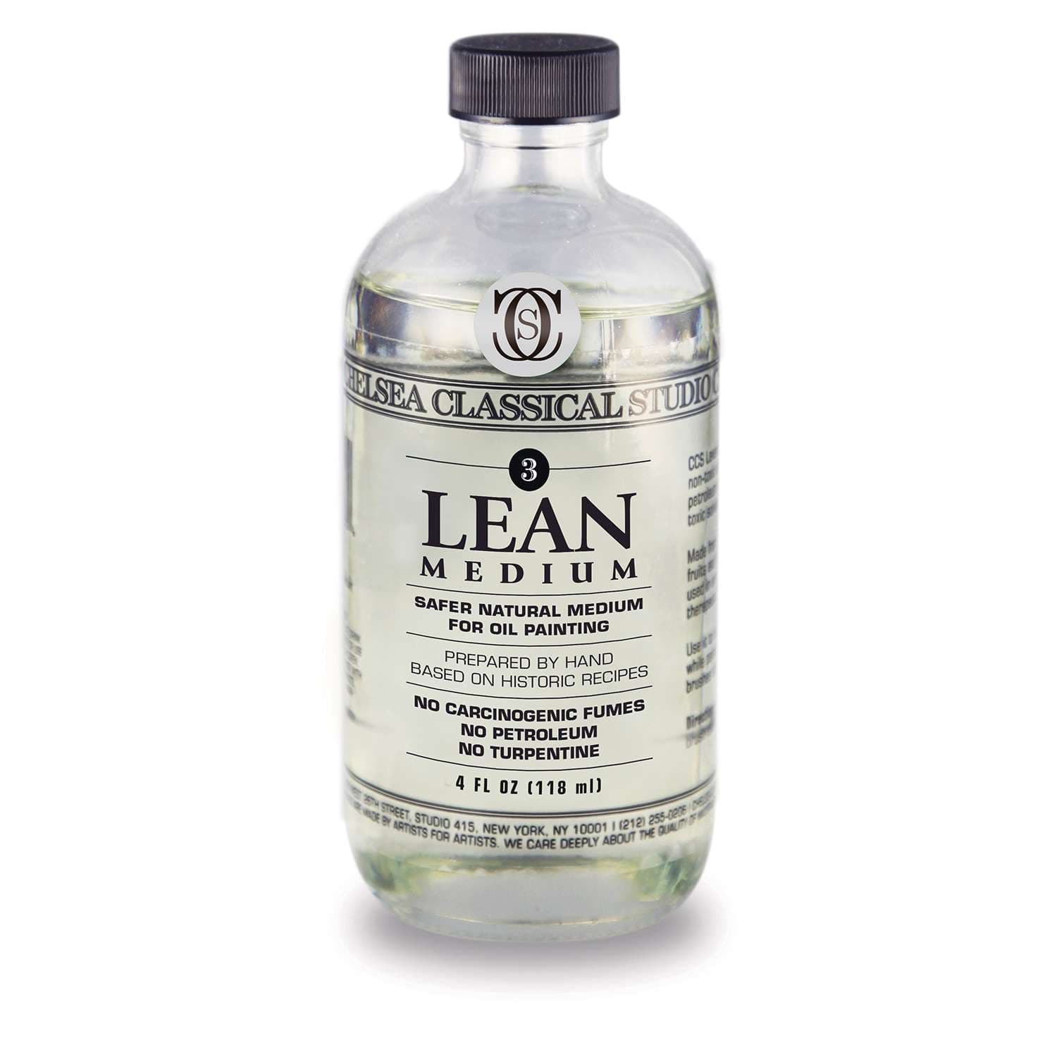 Das Chelsea Classical Studio Lean Medium (Mageres Malmittel) wird aus sichereren, natürlichen, historisch dokumentierten Zutaten hergestellt: Leinsamenöl, Speiklavendelöl und Dammarharz. Das enthaltene Leinsamenöl ist ungiftig, kaltgepresst und natürlich gereinigt. Die Speiklavendelölessenz ist ein sichereres natürliches Lösungsmittel für die Ölmalerei, das schon in der Renaissance von Malern wie Da Vinci, Rubens und Van Dyck genutzt wurde. Sie verdunstet ähnlich schnell wie Terpentin, verursacht aber mit ihrem charakteristischen Lavendelduft keine akuten oder chronischen Gesundheitsprobleme, wie sie mit Terpentin oder geruchlosem Petroleumbenzin assoziiert werden. Der Dammarfirnis wird mit natürlichem, in Speiklavendelölessenz gelöstem Dammarharz hergestellt.