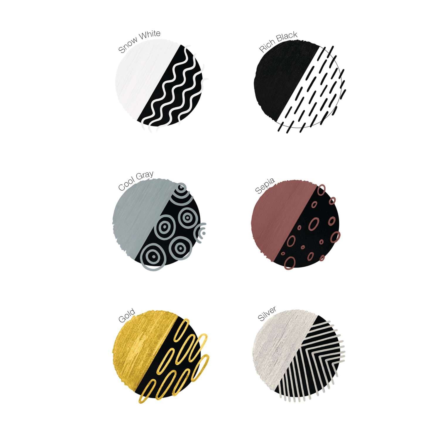 - Snow white, Rich black, Cool grey, Sepia, Gold, Silver