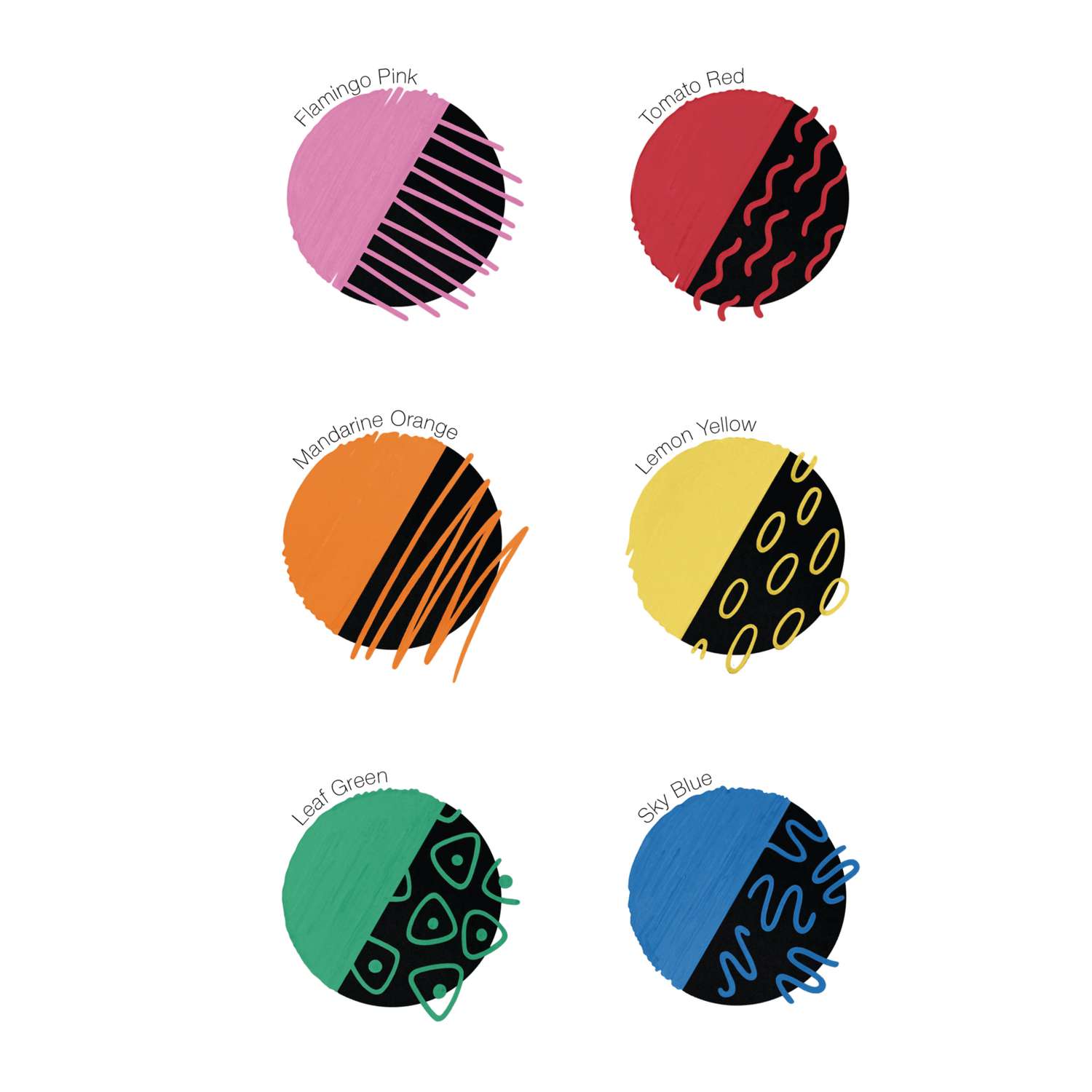 - Flamingo Pink, Tomato Red, Mandarin Orange, Lemon Yellow, Leaf Green, Sky Blue
