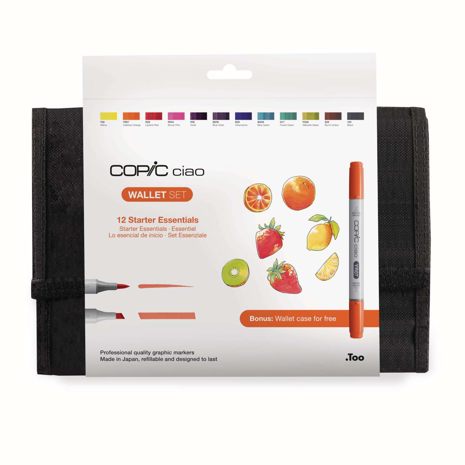COPIC® ciao 12er Set Starter Essentials im praktischen schwarzen Wallet. Das Wallet ist ideal zum Aufbewahren und Mitnehmen der Marker sowie für eine übersichtliche Anordnung. Mit Klett-Verschluss und Einsteckmöglichkeit. Mit Außentasche und Reißverschluss. Zudem ist ein Set im Wallet ist auch eine perfekte Geschenkidee. Der COPIC® ciao ist der ideale, vielseitige Marker für Einsteiger, Schüler, Studenten und Hobbykünstler. Er ist die perfekte Alternative für den preisbewussten Künstler und Grafiker.
