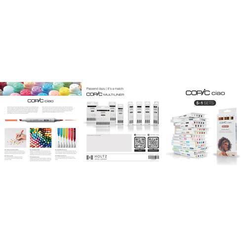 COPIC® ciao Set 5+1 Leuchtende Farben entstand in Kooperation mit jungen Mangaka. Das Set enthält je 5 COPIC® ciao Marker + 1 COPIC® Multiliner mit 0,3 mm Strichstärke in Schwarz. – Preise pro Set.