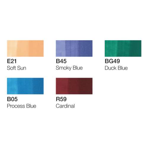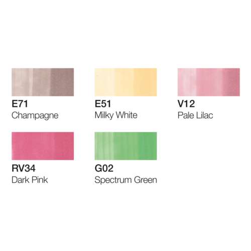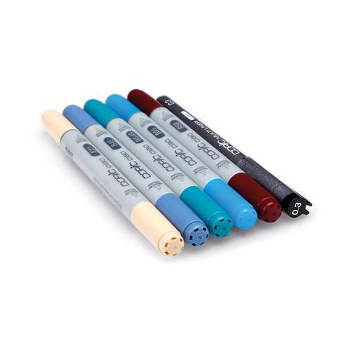 Der COPIC® ciao Marker ist flexibel und schnell durch zwei Spitzen: eine mittelbreite Spitze für große Flächen und eine Pinselspitze für Details. Die Sets enthalten je 5 COPIC® ciao Marker + 1 COPIC® Multiliner mit 0,3 mm Strichstärke in Schwarz. Die Sets enthalten folgende Farben: Set 1: Cadmium Yellow (Y15), Cerise (RV06), Sky (B24), Forest Green (G17) und Bareley Beige (E11). Set 2: Cardinal (R59), Process Blue (B05), Smoky Blue (B45), Duck Blue (BG49) und Baby Skin Pink (E21) Set 3: Dark Pink (RV34), Pale Lilac (V12), Spectrum Green (G02), Milky White (E51) und Champagne (E71) Preise pro Set.