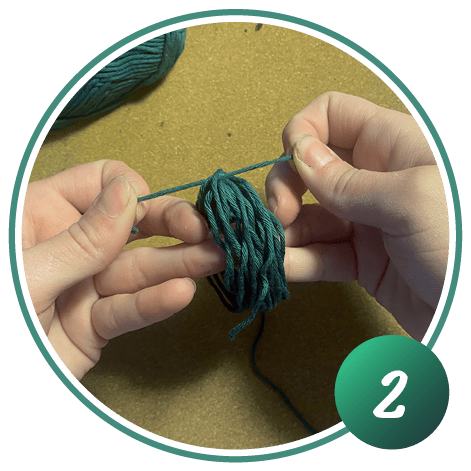Die aufgewickelte Wolle mit einem Stück Wolle in der Mitte zusammen verknoten.