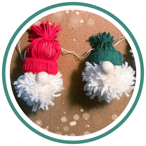 Wolle, verwendete Farben: Weiss (für Bart), Rot und Grün (für Mützen)