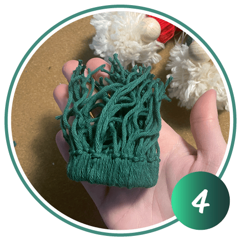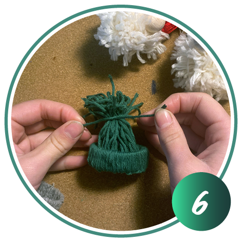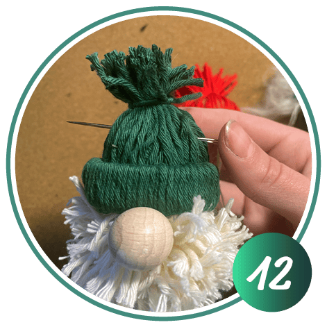 Nehmen Sie einen weiteren Wollfaden und binden Sie die Mütze oben mit einem Doppelknoten zu.