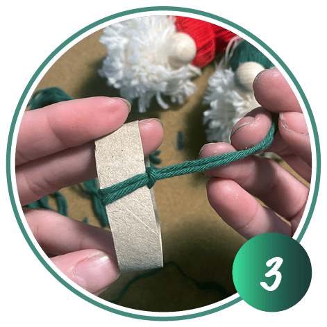 Ziehen Sie nun die kompletten Wollfäden durch die Papprolle auf die andere Seite. Die Knoten sind jetzt unten und ergeben den Rand der Wichtelmütze.