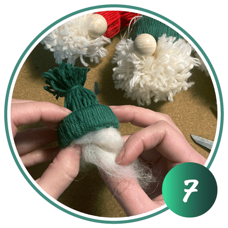 Jetzt wird die Wollmütze an den Wichtelbart verklebt.