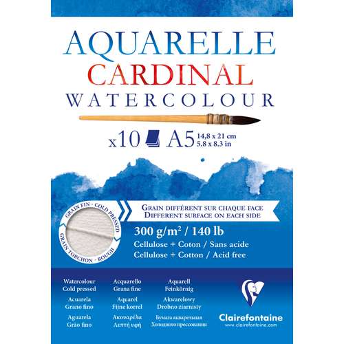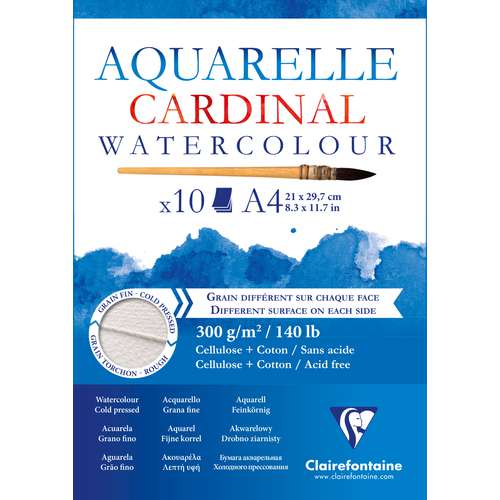 Durch die grob- und feinkörnigen Oberflächenstrukturen auf der Vorder- und Rückseite können verschiedene Aquarelltechniken angewendet werden. Der Clairefontaine Aquarellblock CARDINAL enthält jeweils 10 Blatt und ist in verschiedenen Formaten lieferbar.