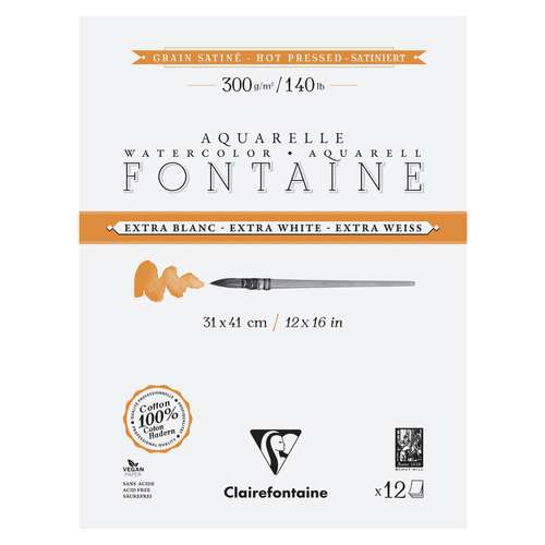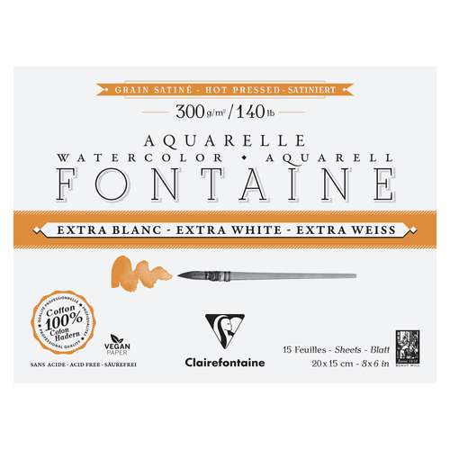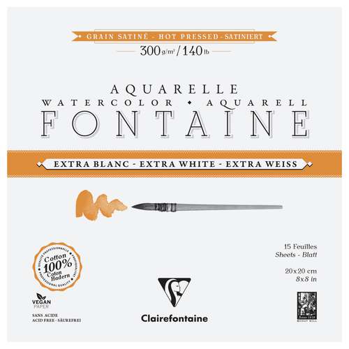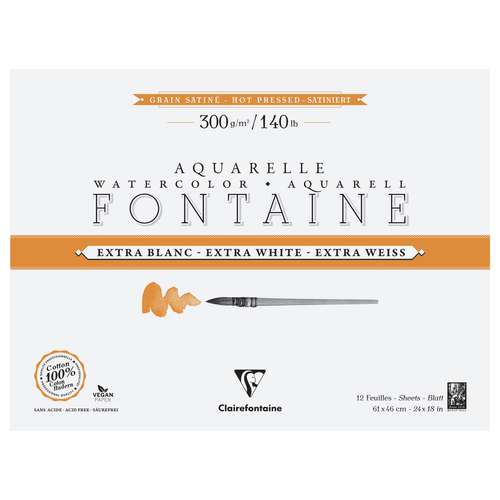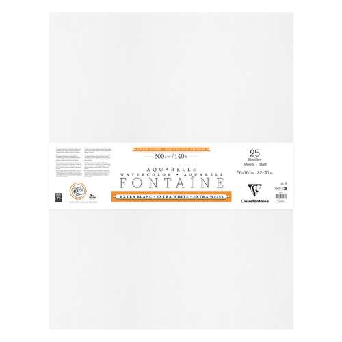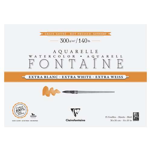 Das satinierte Aquarellpapier Clairefontaine Aquarellpapier FONTAINE Watercolor Extra White ist eine hochwertige Papiersorte, die speziell für die Aquarellmalerei entwickelt wurde. Es zeichnet sich durch eine glatte, gleichmäßige Oberfläche aus, die im Vergleich zu herkömmlichem Aquarellpapier weniger Textur aufweist. Durch die satinierte Oberfläche nimmt das Papier weniger Wasser auf, was die Farben lebendiger und intensiver erscheinen lässt. Diese feine Beschaffenheit ermöglicht detaillierte Arbeiten mit scharfen Kanten und präzisen Linien, wie zum Beispiel botanische Illustrationen oder detaillierte Porträts, zu erstellen. Zudem eignet es sich auch hervorragend für Mixed Media mit Finelinern, Farbstiften und Tusche.