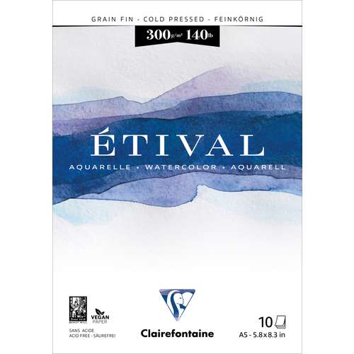 Der Clairefontaine ETIVAL Aquarellblock 300 g, feinkörnig ist kopfgeleimt. Ein lichtbeständiges und sehr absorptionsfähiges Aquarellpapier aus 100 % Zellstoff mit einem natürlichen Weiß. Der Clairefontaine ETIVAL Aquarellblock feinkörnig ist ideal für Anwendungen im Naßbereich.