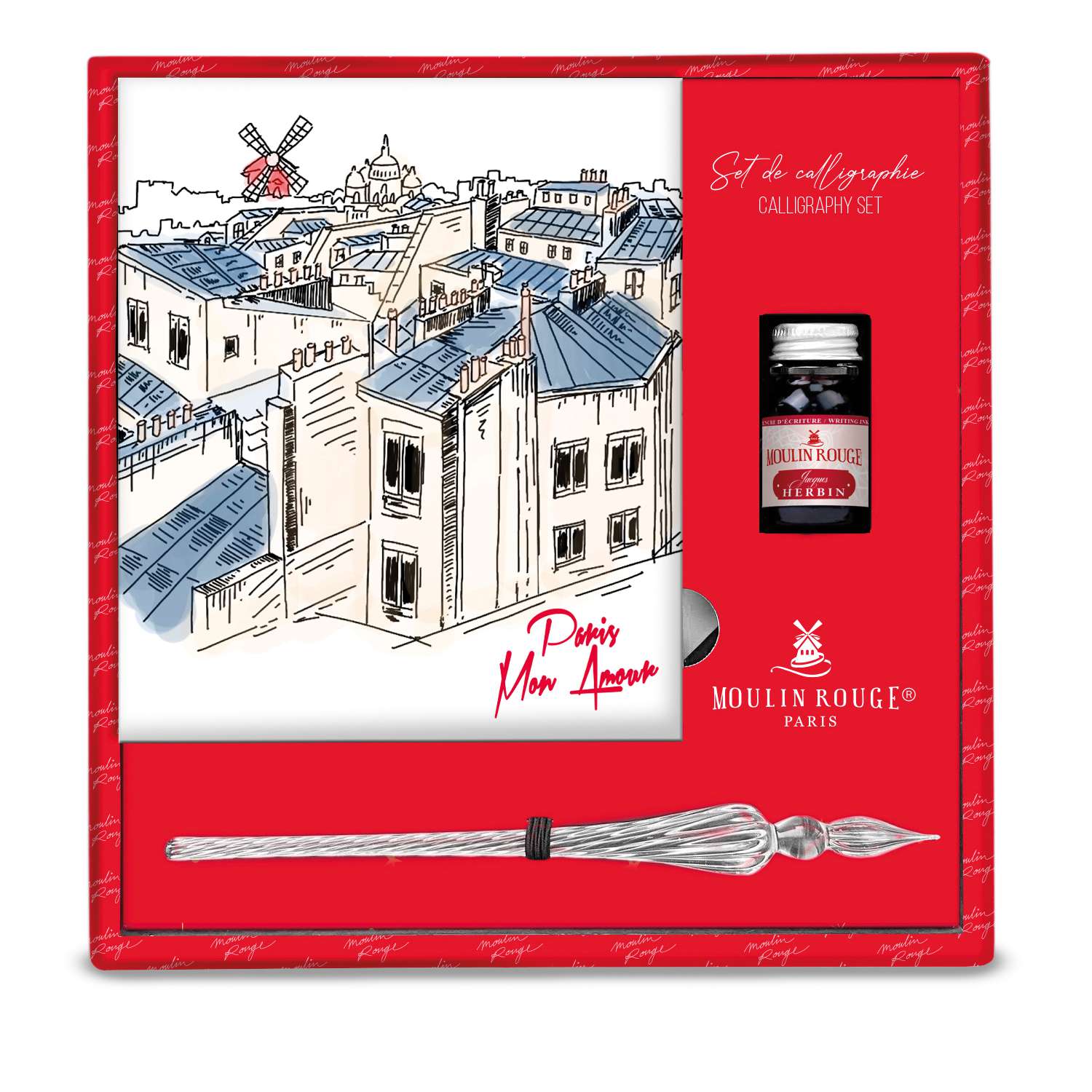 Das Set enthält eine handgefertigte Glasfeder, ein 10-ml-Tintenfläschchen in der leuchtend roten Farbe „Moulin Rouge“ sowie einen quadratischen Kalligrafieblock mit 52 Blatt in verschiedenen Farben und Papierstärken. Damit bietet es alles, was für den Einstieg oder das kreative Arbeiten mit Tinte benötigt wird.