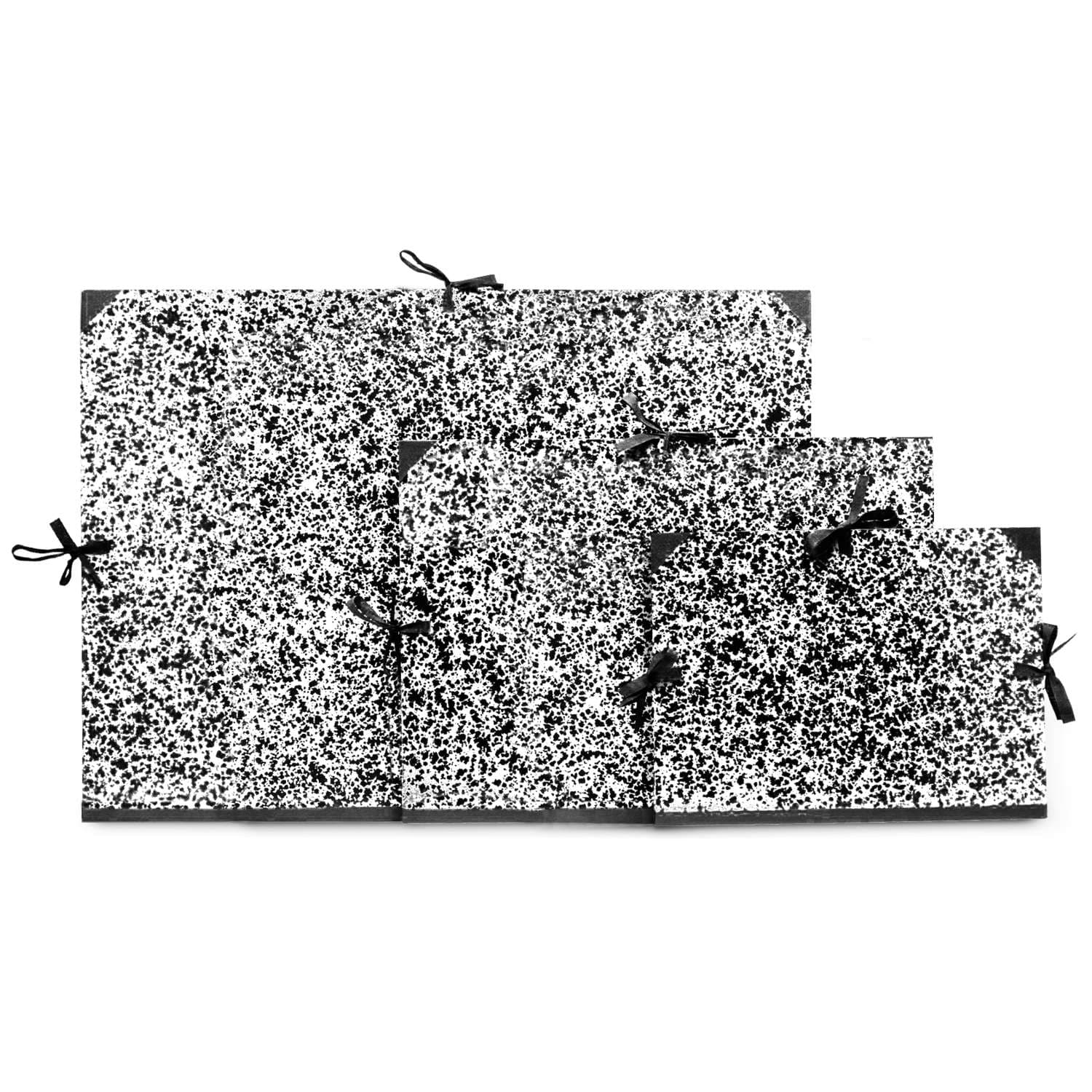 Zeichenmappe in klassischem, französischem Design. Die Zeichenmappe "Annonay" ist aus äußerst stabiler Graupappe gefertigt und mit weiß-schwarzem Dekorpapier überzogen. Zudem ist die Zeichenmappe glanzfolienkaschiert und dadurch Schmutz abweisend. Die Mappe ist säurefrei und ermöglicht somit auch längere Aufbewahrungszeiten ohne dabei den Inhalt zu schädigen. Ecken und Rücken der Zeichenmappe sind mit Leinen verstärkt, sodass diese Aufbewahrungsmappe besonders stabil ist. Die Zeichenmappe wird mit 3 Leinenbändern verschlossen. Die Aufbewahrungsmappe ist ohne Innenklappen.