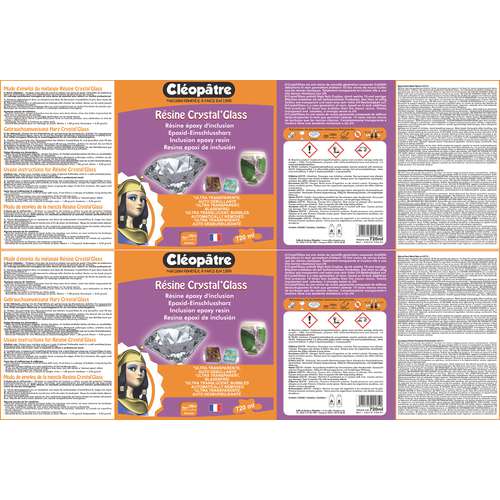 Cléopâtre Crystal'Glass ist ein neuartiges Einschlussharz, das aus Hi-Tech-Zusätzen besteht. Das Harz ist vollständig transparent, farblos, besitzt eine sehr gute UV-Beständigkeit, ist geruchlos und frei von Lösungsmittel.