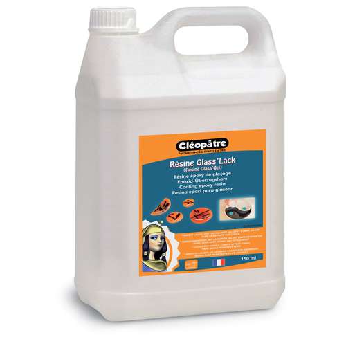 Cléopâtre Glass'Lack ist ein neues, geruchloses Epoxidharz. Es enthält Zusätze, durch welche keine Blasen entstehen. Auf absolut ebenem Untergrund bildet es durch seine gelförmige Konsistenz bis zu einer Schichtdicke von 2 mm einen gewölbten Rand und stoppt an den Kanten einer ebenen Auftragsfläche. Hochglänzend, selbst bei sehr dünnem Auftrag mit Pinsel oder Spatel. Sehr harter Film nach Trocknung. Hält auf allen Untergründen, selbst auf Modelliermassen. Aushärtezeit von 12 bis 24 Stunden. Schichtdicke: min 1 bis max 4 mm. Mischung: 2/3 Harz,1/3 Härter.