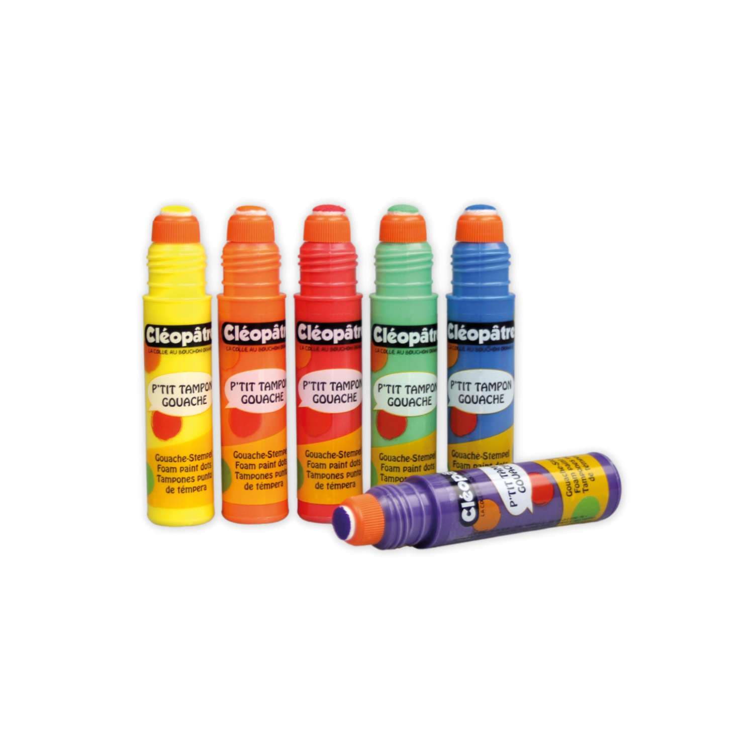 Das Cléopâtre P'TIT TAMPON Gouache-Set bietet sechs leuchtende Stempelfarben à 50 ml in hochwertiger Gouache-Qualität. Ideal für kleine Künstler! Die handlichen Flaschen sind speziell für Kinderhände konzipiert: flexibel, leicht zu drücken und mit praktischen Schaumstoffspitzen (13 mm) ausgestattet. So wird Tupfen, Ausmalen, Zeichnen oder Schablonieren zum Kinderspiel ganz ohne Pinsel und Farbkleckse.