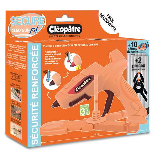 Das Cléopâtre SECURE CLÉO’GUN FIX Heißklebepistolen Set ist ein Entdecker-Set und enthält 1 CLÉO’GUN FIX Heißklebepistole in der „SECURE“-Version: Für Ihre Sicherheit – die Spitze wechselt die Farbe und wird rot, sobald die Pistole heiß ist.