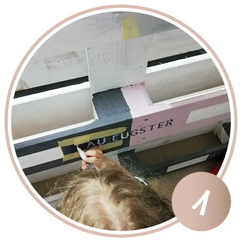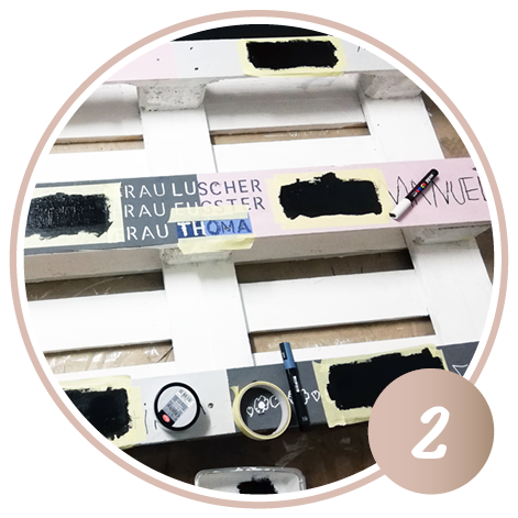 Danach kann die Palette nach Belieben dekoriert werden! Nutzen Sie dazu zum Beispiel die Schablone für Namen oder Texte. Mit den Acrylmarkern eignen sich detaillierte Muster oder Unterschriften.