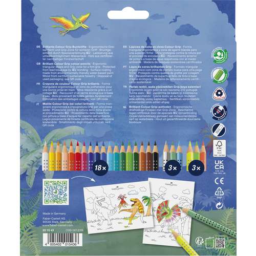 Das FABER-CASTELL Colour Grip Special Edition Dino Set enthält 18 Colour Grip Farbstifte + 3 Neon Buntstifte + 3 Metallic Buntstifte. Inklusive Dino Sticker für tolle Motive und Kunstwerke.