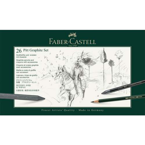 Das FABER-CASTELL PITT Graphite-Set besteht aus einer 26-teiligen Auswahl an Zubehörteilen, Stiften und Kreiden in verschiedenen Härtegraden mit professionellem Anspruch. Die Zeichenutensilien sind ideal für grafisches und flächiges Arbeiten sowie zum Skizzieren. Verschiedene Härtegrade bieten dem Künstler große Variationsmöglichkeiten. Die Grafitstifte sind wahre Meister für kontrastreiches und großflächiges Malen, die Kreiden ein hervorragendes Arbeitsmedium für sehr große Skizzen und Flächen mit hoher Ergiebigkeit. Das FABER-CASTELL PITT Graphite-Set ist gut sortiert für den mobilen Einsatz.