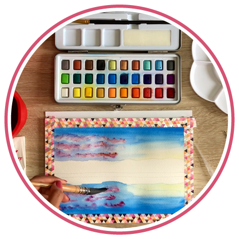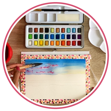 Befeuchten Sie den Pinsel mit Wasser und streifen Sie ihn am Rand des Wasserbechers ab. Nehmen Sie mit dem Pinsel die hellblaue Farbe auf und beginnen Sie am oberen Rand des Himmels. Setzen Sie die Farbe oben kräftiger auf und reduzieren Sie den Druck nach unten hin, um einen sanften Farbverlauf zu erzeugen. Fügen Sie oben ein wenig Dunkelblau hinzu, um den Farbverlauf zu intensivieren und mehr Tiefe zu erzeugen. Jetzt fügen Sie etwas Violett hinzu, das nach unten hin bis zur Linie der Hügellandschaft reicht und nur bis zur Hälfte des Bildes verläuft.