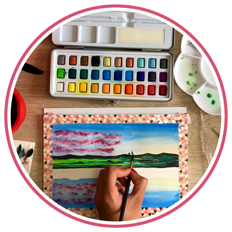 Waschen Sie den Pinsel aus und verwischen Sie die blaue Farbe im verbleibenden Teil des Himmels mit etwas Wasser. Fügen Sie neben dem Violett etwas Gelb hinzu und vermischen sie es an den Übergängen mit der blauen und violetten Farbe. Nehmen Sie die rote Farbe auf und tupfen Sie in kleinen kreisenden Bewegungen über das Violett, um Wolken zu erzeugen. Fügen Sie bei den Wolken ein wenig Orange mit hinzu.