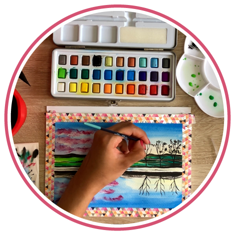 Nehmen Sie nun wieder den grossen Pinsel und fügen Sie zwischen der Landschaft und der Spiegelung im Wasser ein wenig verdünntes Hellblau hinzu. Wie beim Himmel tragen Sie links wieder ein wenig Violett und rechts ein wenig Gelb auf.