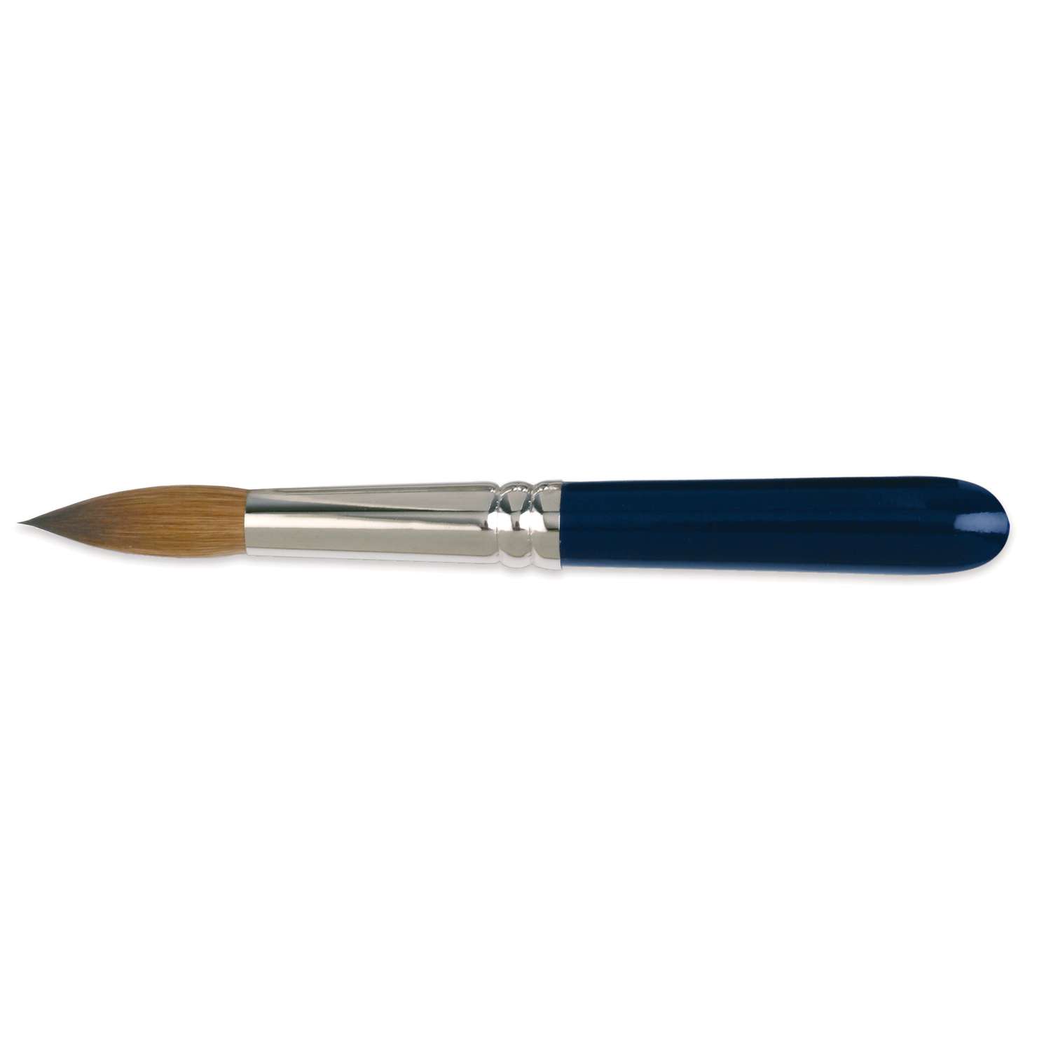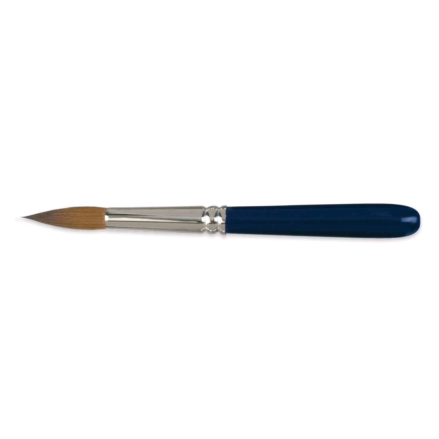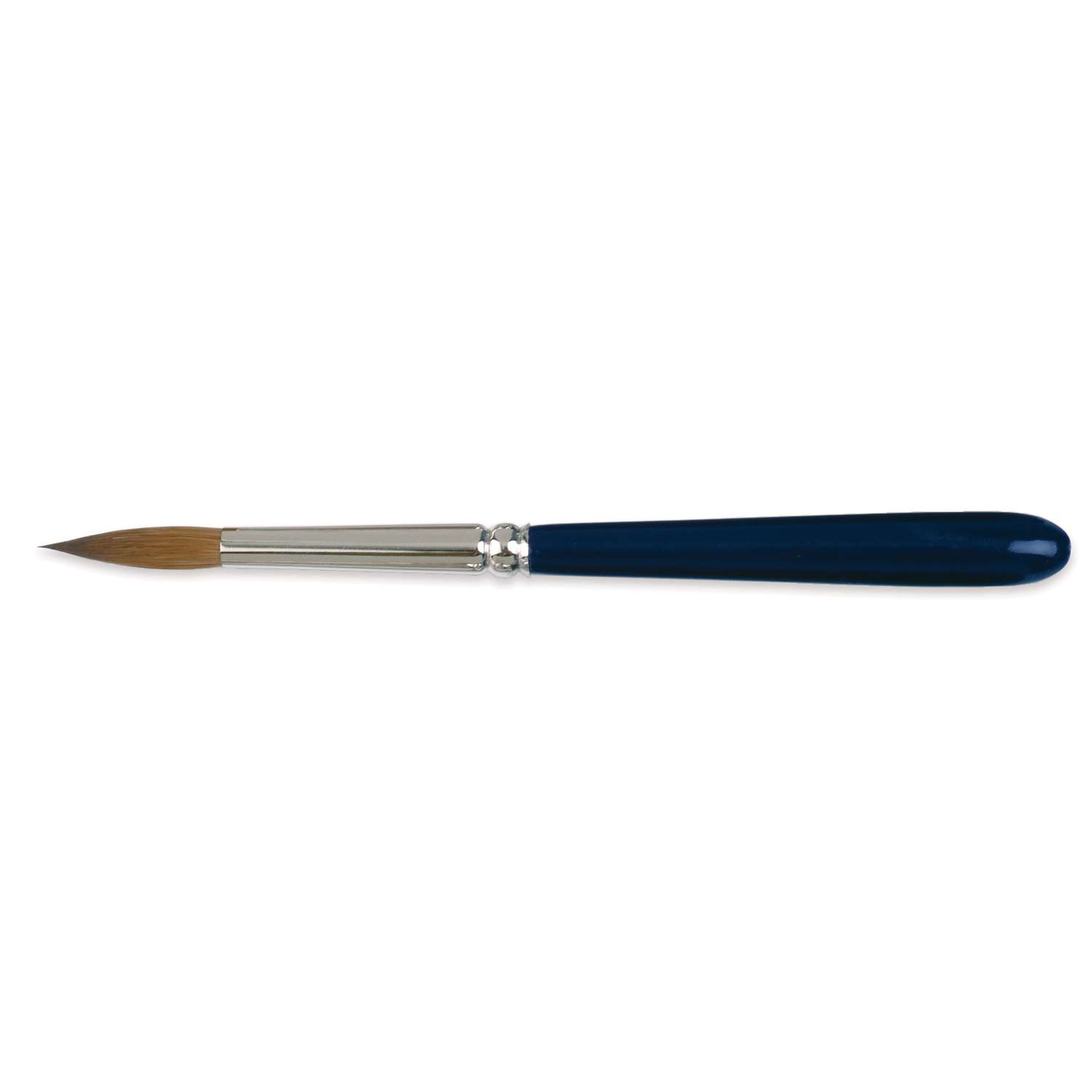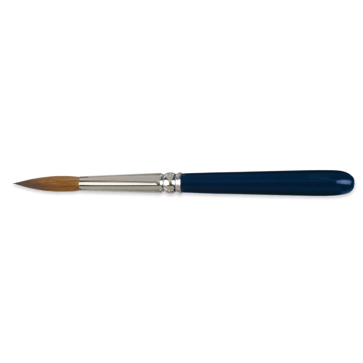 Reise-Aquarellpinsel spitz, echte sibirische Kolinsky- Rotmarderhaare, nahtlose Silberzwingen, extrakurze, indigoblaulackierte Stiele. Durch den extra kurzen Holzstiel liegt dieser Pinsel sehr gut in der Hand.
