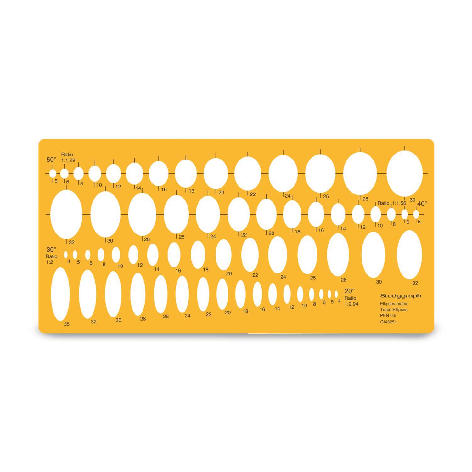 - Robuste Schablone mit 62 Ellipsen in vier Winkeln (20°, 30°, 40°, 50°)