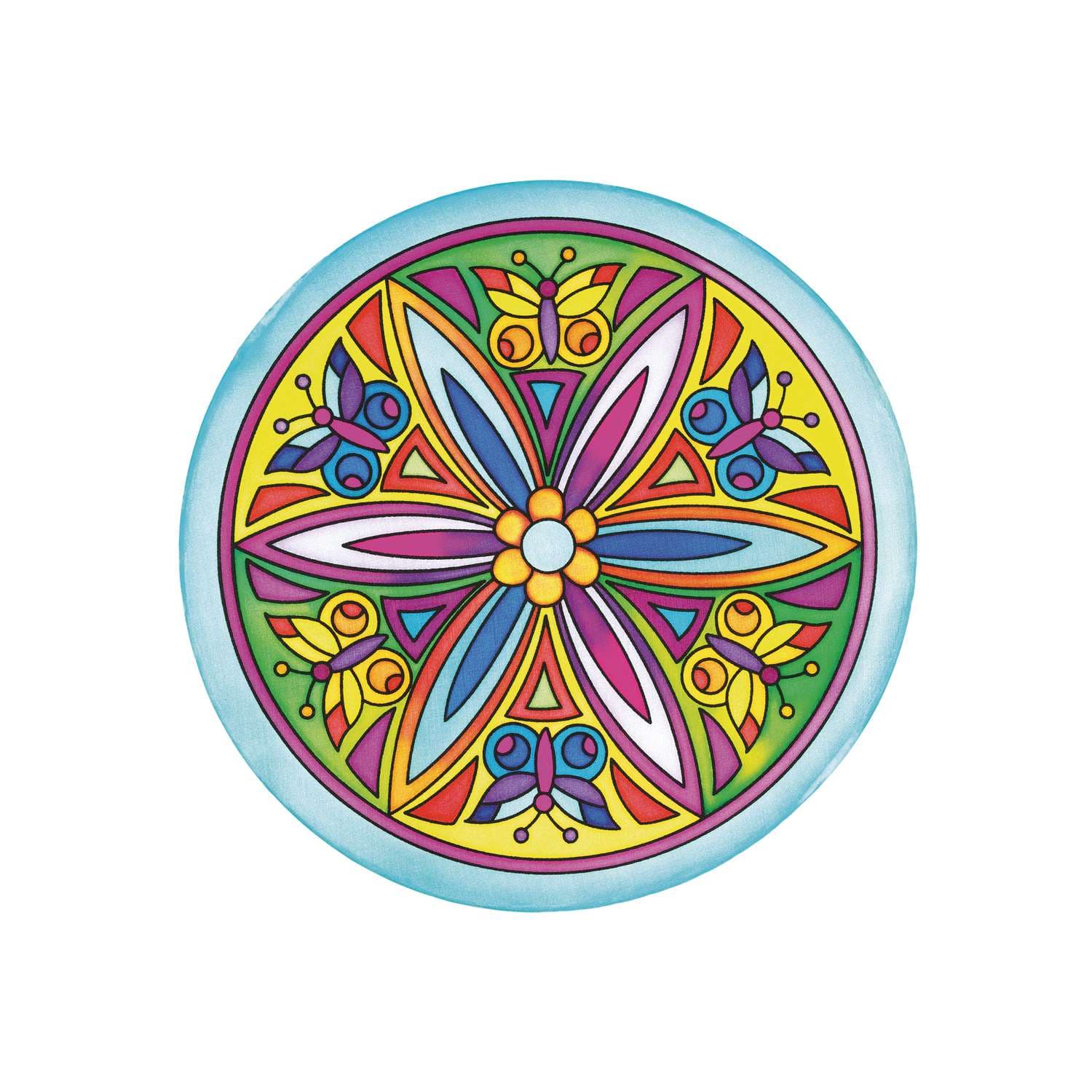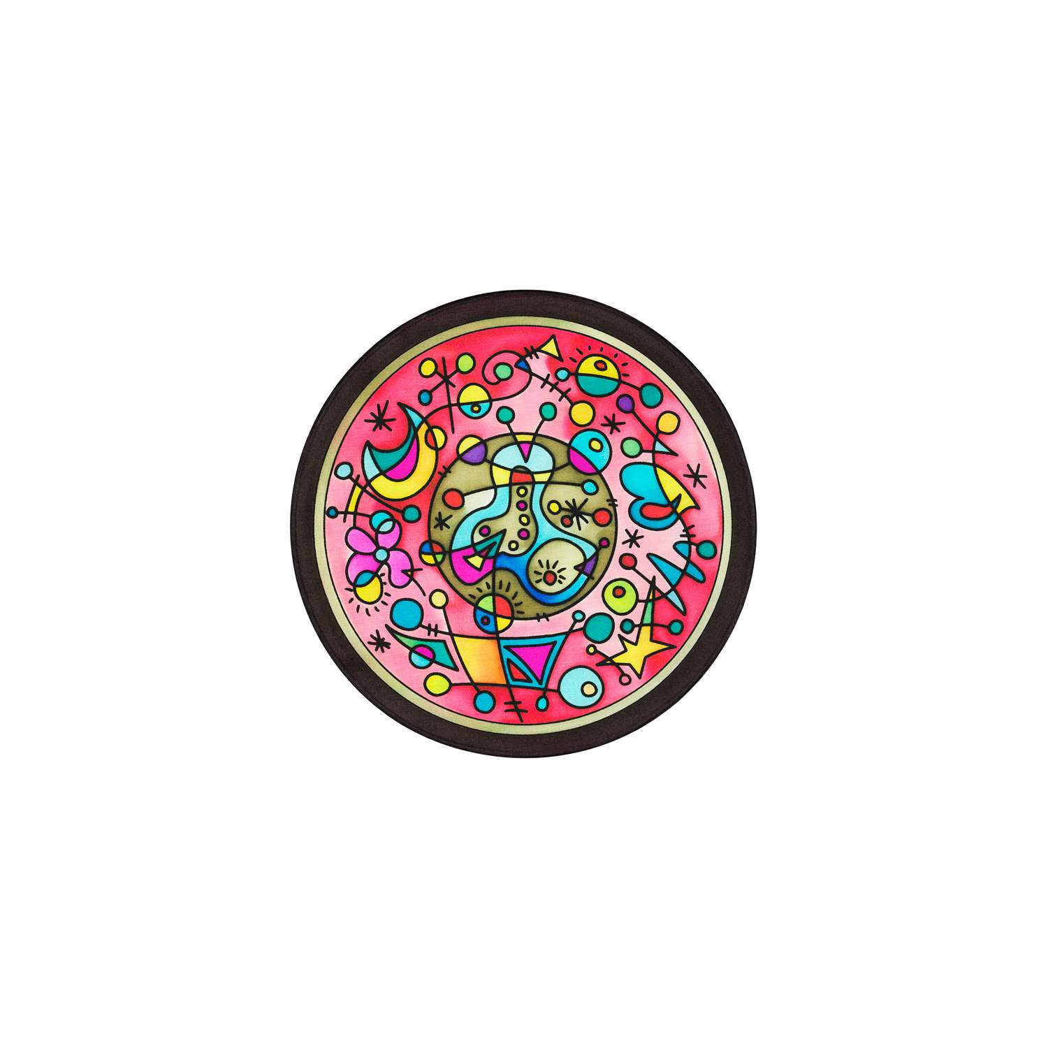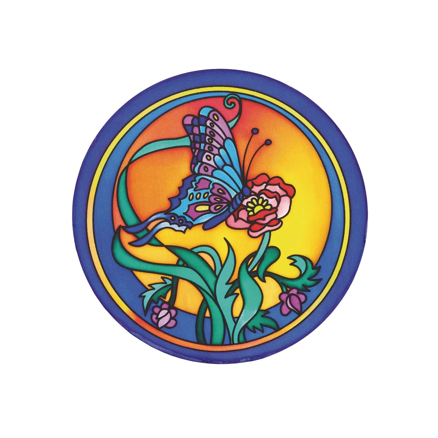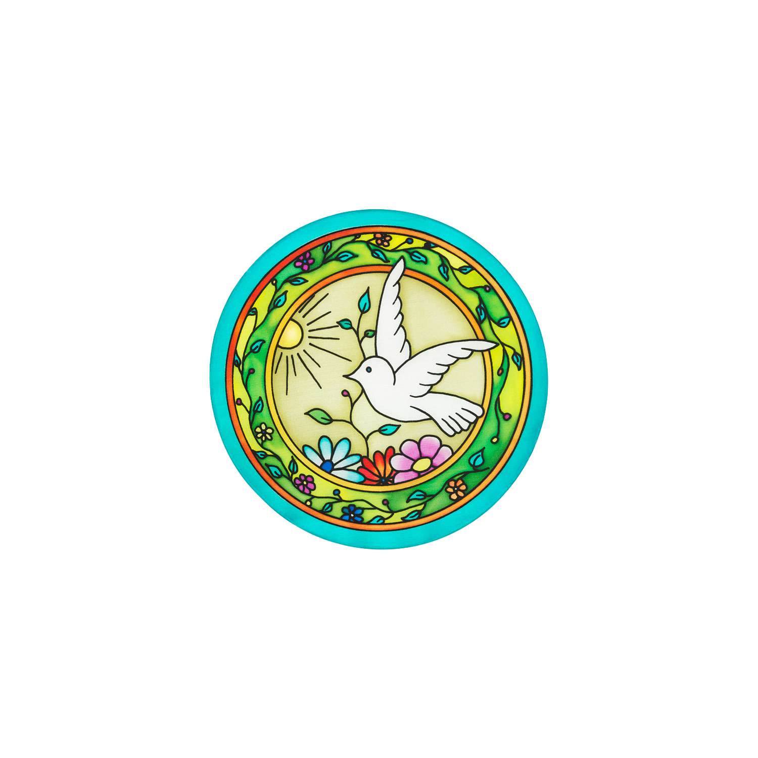 Runde Gutta-Fensterbilder aus 100 % Seide mit Gutta-Kontur bedruckt, für eine besonders einfache Handhabung.