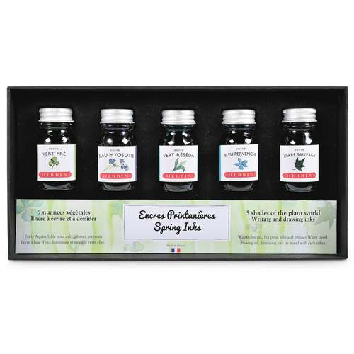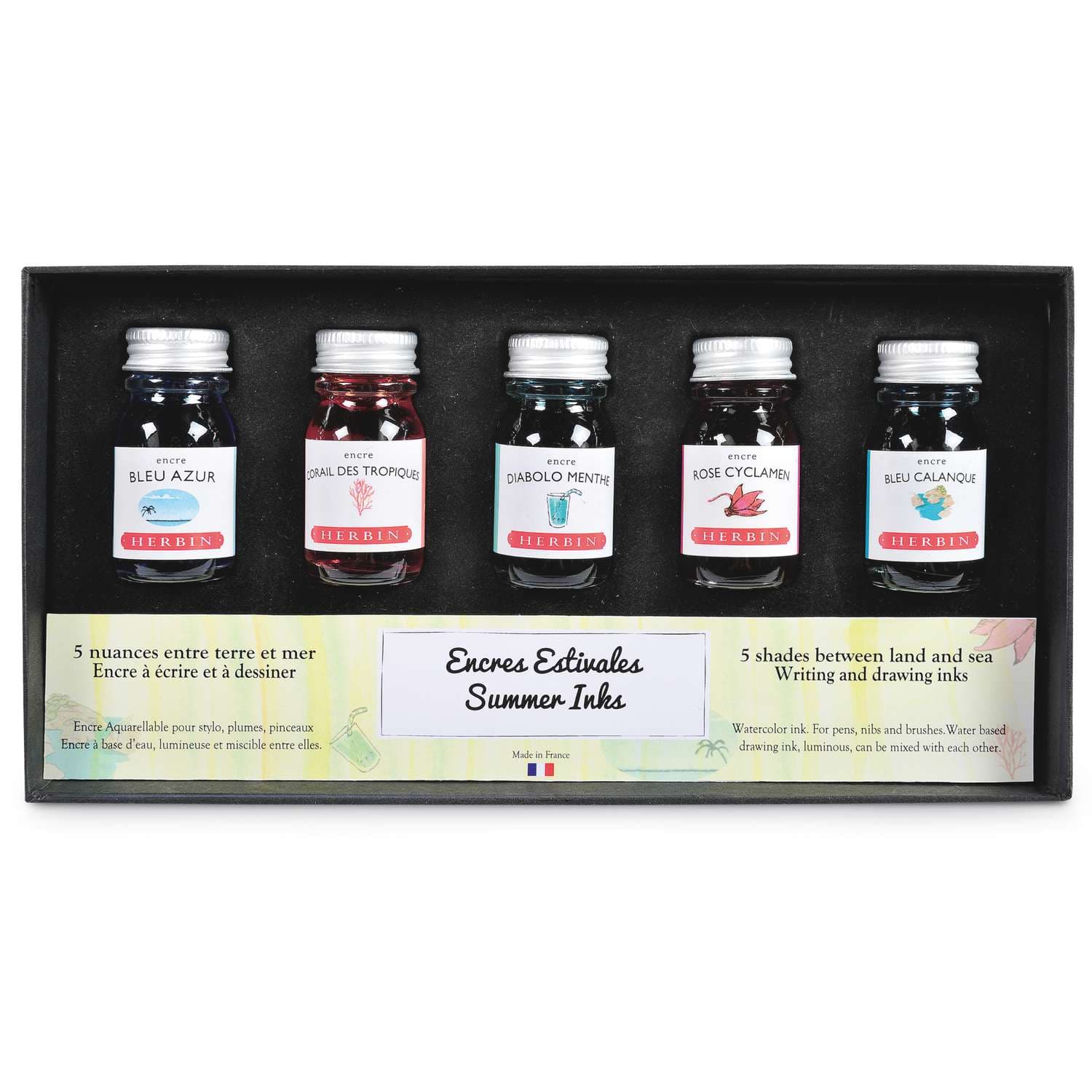 Die wasserbasierte Tusche von Herbin ist ideal geeignet für Zeichnen, Kalligraphie und Schreiben. Erhältlich in verschiedenen themensortierten Sortierungen mit je 5 x 10 ml. Hervorragend zum Testen und Ausprobieren.