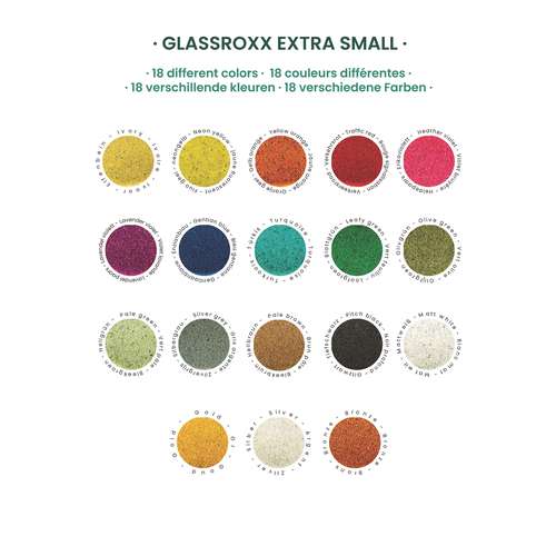 GlassRoxx ist ein vielseitiges Glasgranulat aus recyceltem Altglas, eingefärbt mit nachhaltigen Pigmenten auf Wasserbasis. Dieses umweltfreundliche Produkt überzeugt nicht nur durch seine Nachhaltigkeit, sondern auch durch seine Vielseitigkeit und einfache Anwendung. Perfekt für kreative Projekte!