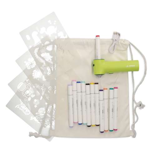 - Lieferumfang: 1x elektrische Airbrush, 12 x Duo Textilmarker, 4 x Schablonen, 1 x Sportbeutel, 1 x USB Ladekabel (ohne Netzteil)