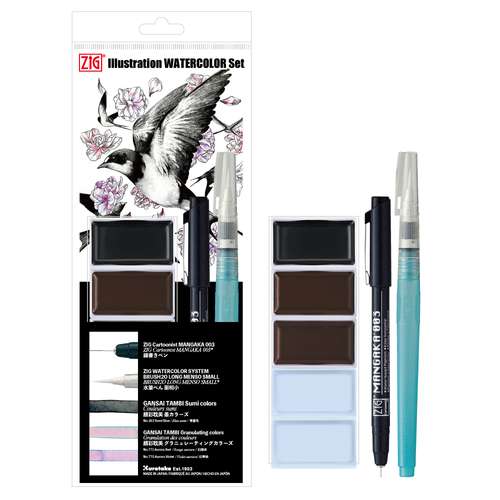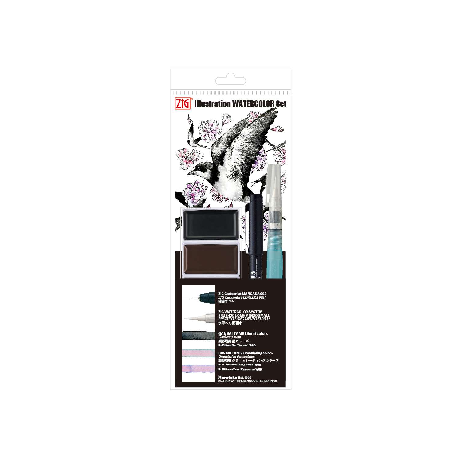 Das Kuretake ZIG® Illustration Aquarell Set ist ein Illustrationsset, das Linienzeichnung und Aquarelltechniken in einem kompakten Kit kombiniert. Es eignet sich für Illustration, Manga, Kalligrafie und kreative Zeichnungen, bei denen präzise Linien und farbige Aquarelleffekte miteinander verbunden werden.