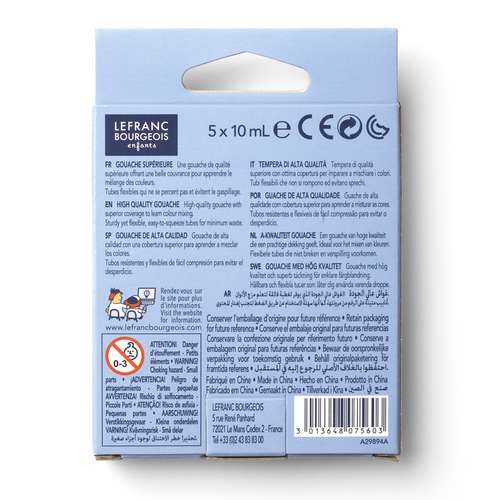 Das LEFRANC & BOURGEOIS Gouache-Set besteht aus 5 Gouachefarben in Tuben à 10 ml. Durch die hervorragende Mischbarkeit ist das gesamte Farbspektrum abgedeckt. Geeignet für die verschiedensten Malgründe, wie z.B. Papier, Holz Karton, Stoff oder Gips. Ideal für Kindergärten, Schulen und Hobbymaler.