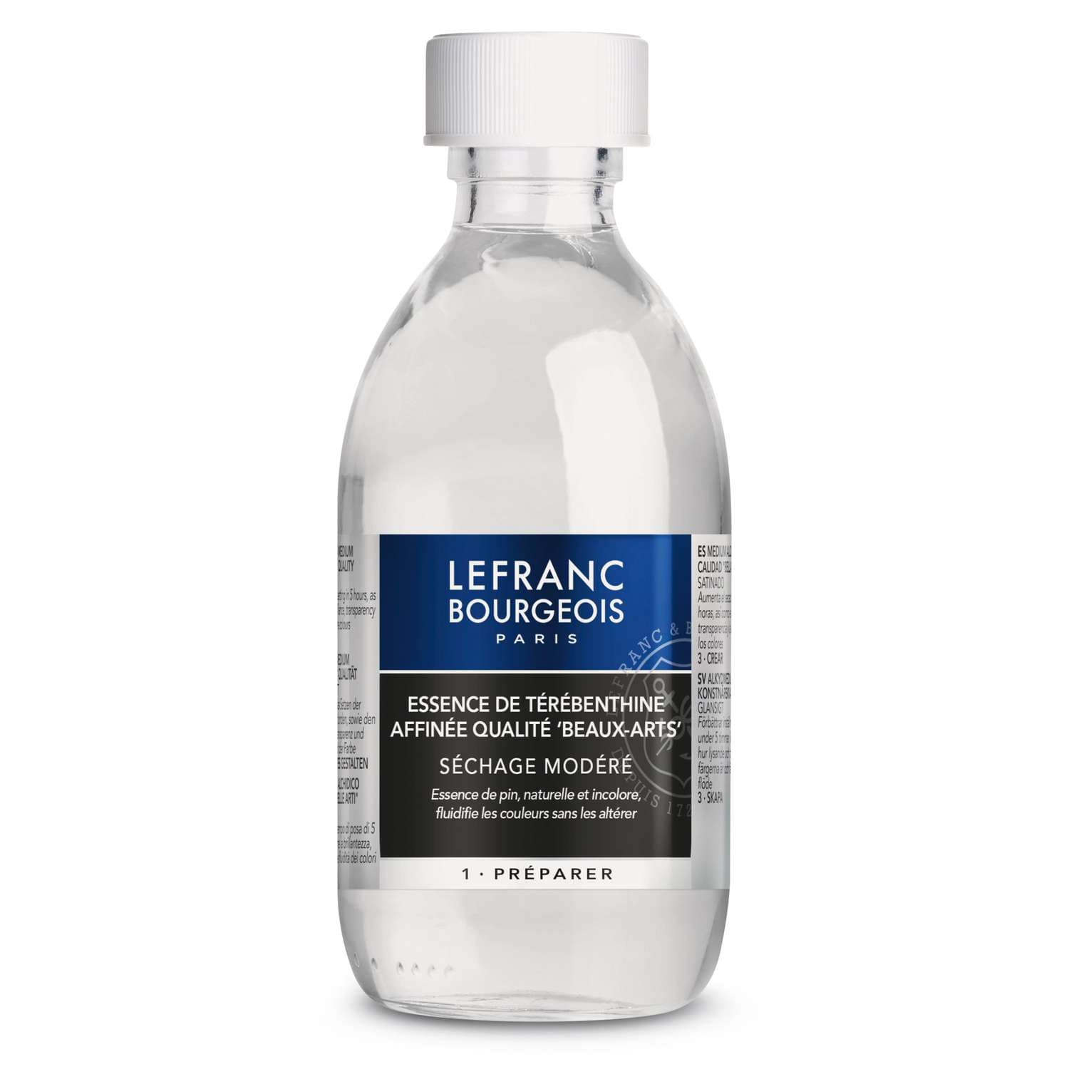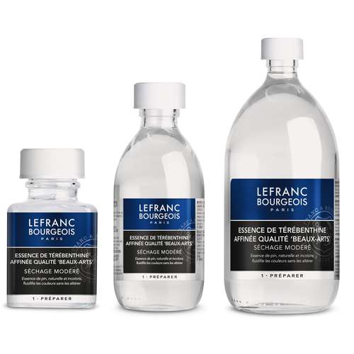 Traditionelle Öle aus dem Hause Lefranc&Bourgeois: Art.-Nr. 20521-20524 Gereinigtes Terpentinöl (Rectifined Turpentine) Wird aus der Destillation von Pinienharz gewonnen. Farblos und sehr dünnflüssig. Zum einfachen Verdünnen von Farben. Verdunstet sehr schnell, für erste Skizzen und schnelle Entwürfe geeignet. At.-Nr. 20525-20526 Lavendelöl (Oil of Spike Lavender) Wird aus der Destillation von Lavendel gewonnen. Verdunstet sehr langsam, daher für länger dauernde Bildentwürfe geeignet. Gibt den Farben einen hohen Fettgehalt und verbessert die Haftung an den unteren Schichten. Preise pro Flasche.