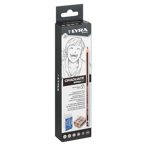 Das LYRA GRADUATE MANGA Set ist die perfekte Wahl für die kreative Phase bei der Erstellung von Manga-Zeichnungen. Es enthält sechs hochwertige Graphitstifte in verschiedenen Härtegraden, einen Doppelanspitzer aus Holz sowie einen LYRATO Radiergummi.