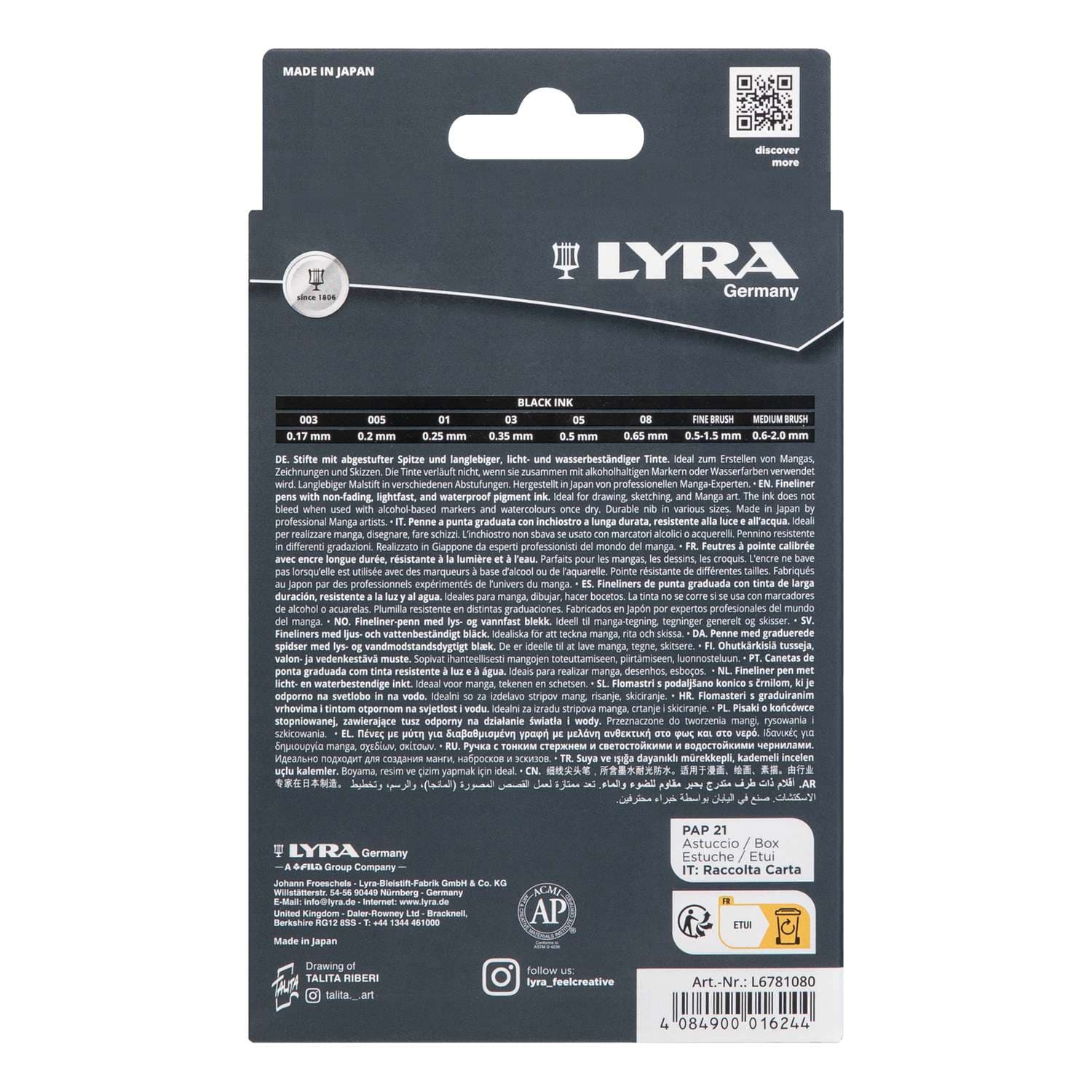 Die LYRA GRADUATE MANGAPEN Sets sind die perfekte Wahl für die Tuschphase Ihrer Manga-Bleistiftskizzen. Die MANGAPENs bieten hochwertige, wasserfeste und radierbare Tinte, die beim Einsatz mit alkohol- und wasserbasierten Markern nicht verläuft. Sie sind ideal, um Details auszuarbeiten, Stimmungen zu erzeugen und Emotionen darzustellen.