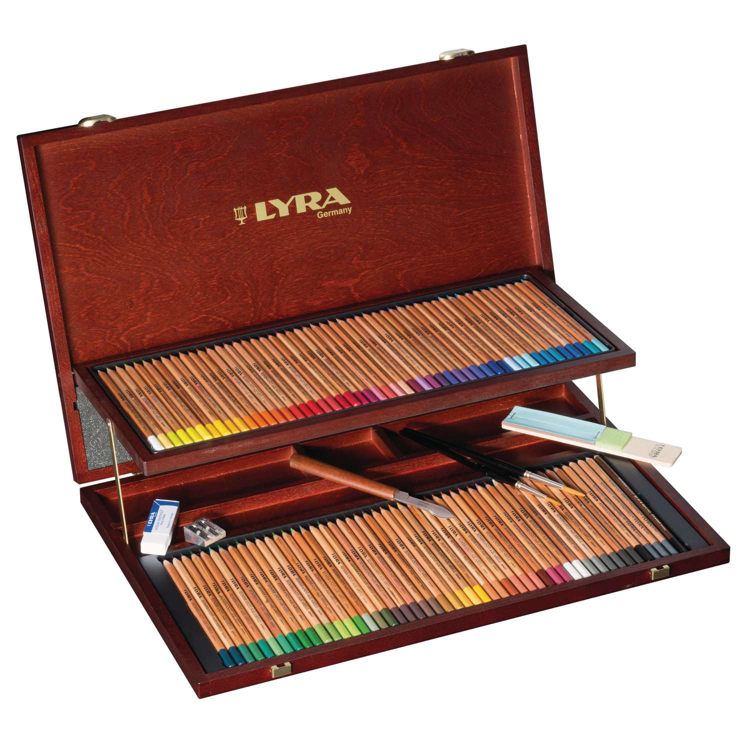 Holzkoffer mit folgendem Inhalt: 96 Aquarell-Farbstifte, davon 24 Farbtöne doppelt, 3 Grafit Aquarellstifte, 1 Schwarzkreidestift, fettfrei, 2 Pinsel (Nr. 5 + 8), 1 Radiermesser, 1 Minenreibebrettchen, 1 Radierer und 1 Metalldoppelspitzer.