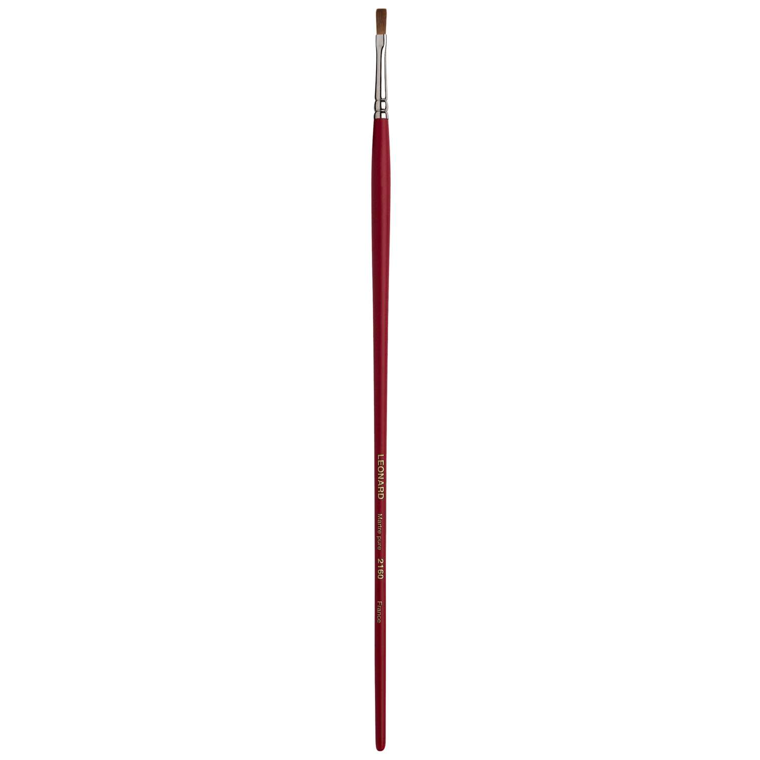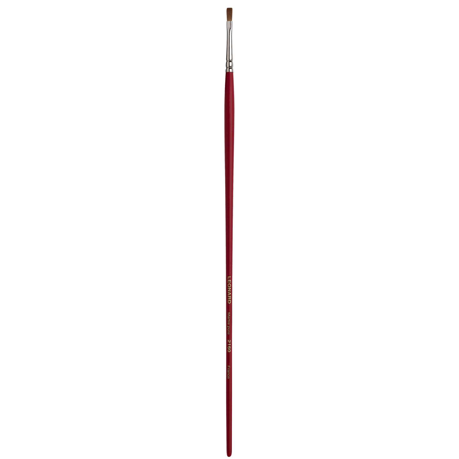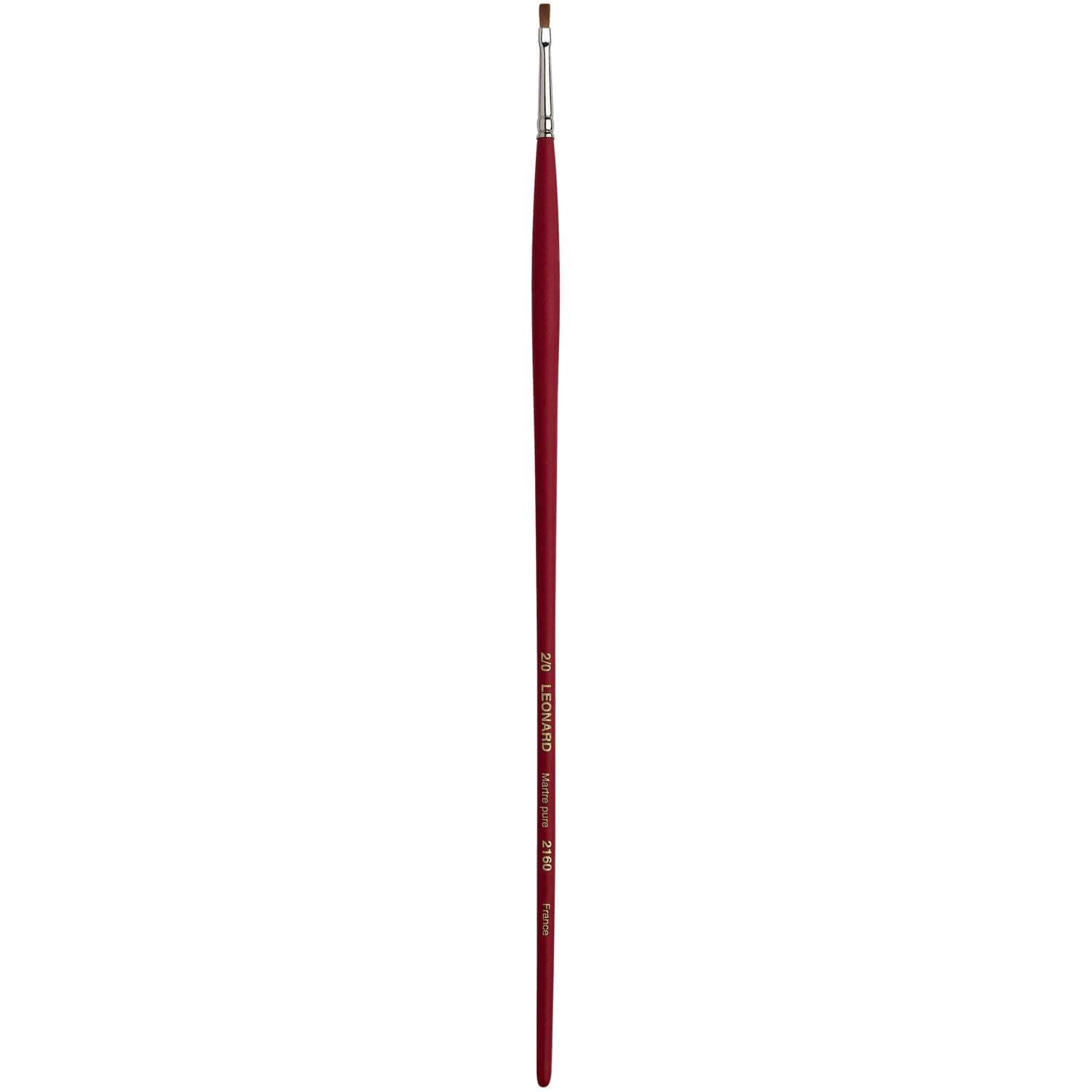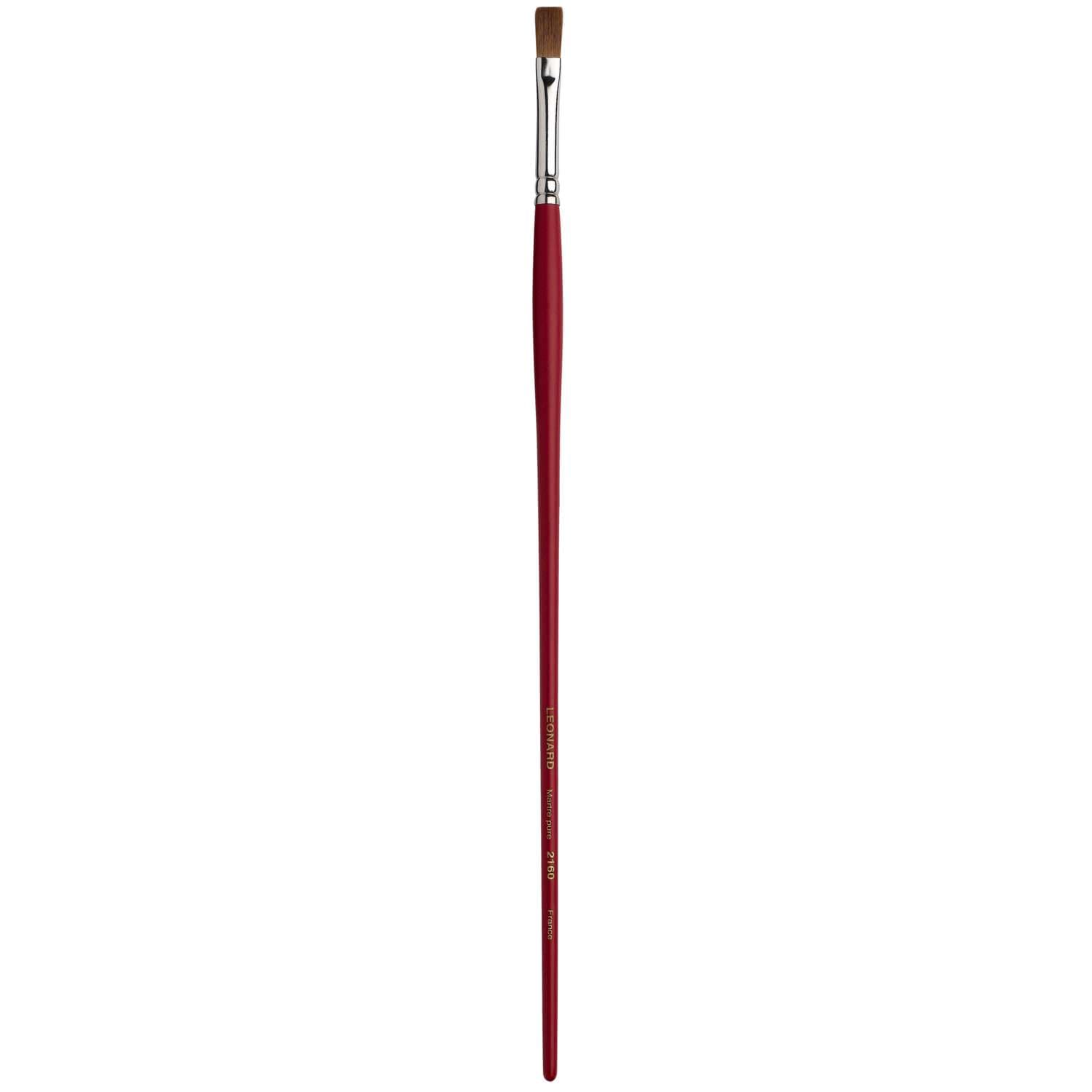 Dünner Flachpinsel mit kurzen Borsten, Rotmarderhaare, Silberzwinge, langer, roter Stiel. Diese Léonard Rotmarderpinsel der Serie 2160 eignen sich für die Öl- und Acrylmalerei. – Preise pro Stück.